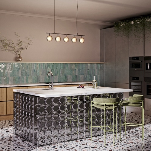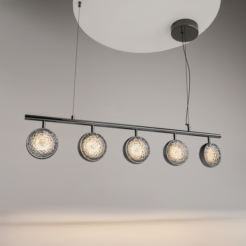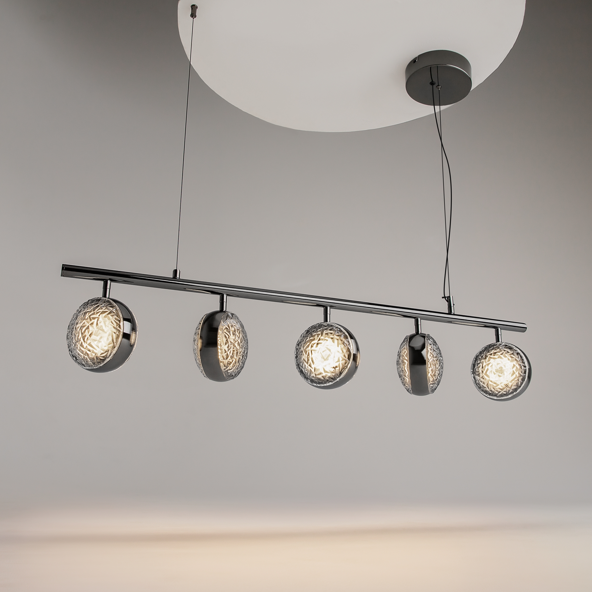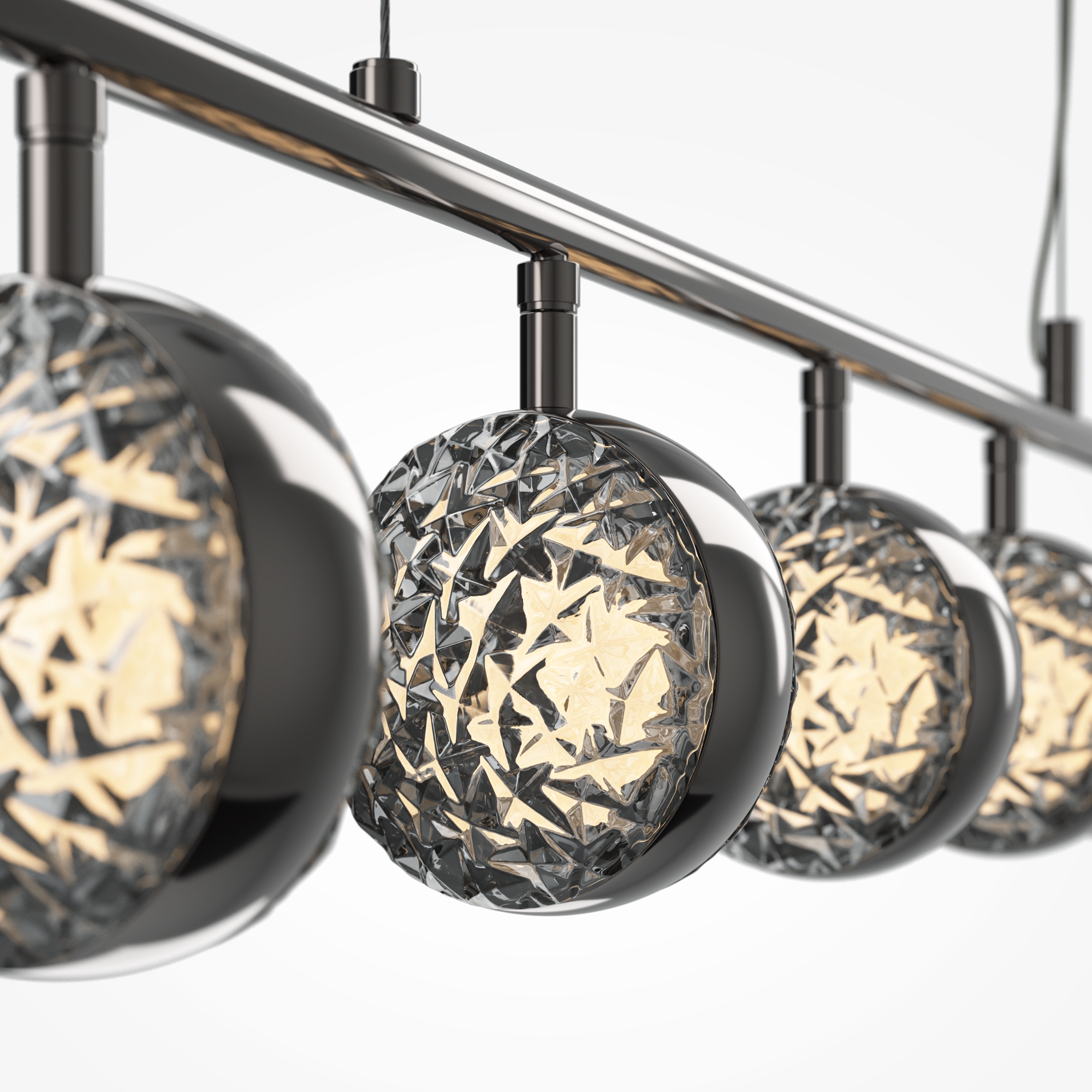 Два цветовых сочетания: сатинированная арматура из металла в цвете латунь в комбинации со стеклянными плафонами янтарного оттенка или трендовый черный хром с глянцевым финишем в сочетании с тонированными светло-серыми плафонами. Источник света: LED. Цветовая температура 3000К, угол рассеивания 120 градусов. Провод длиной 3 м можно регулировать по высоте — светильник подходит для помещений с высокими потолками.
