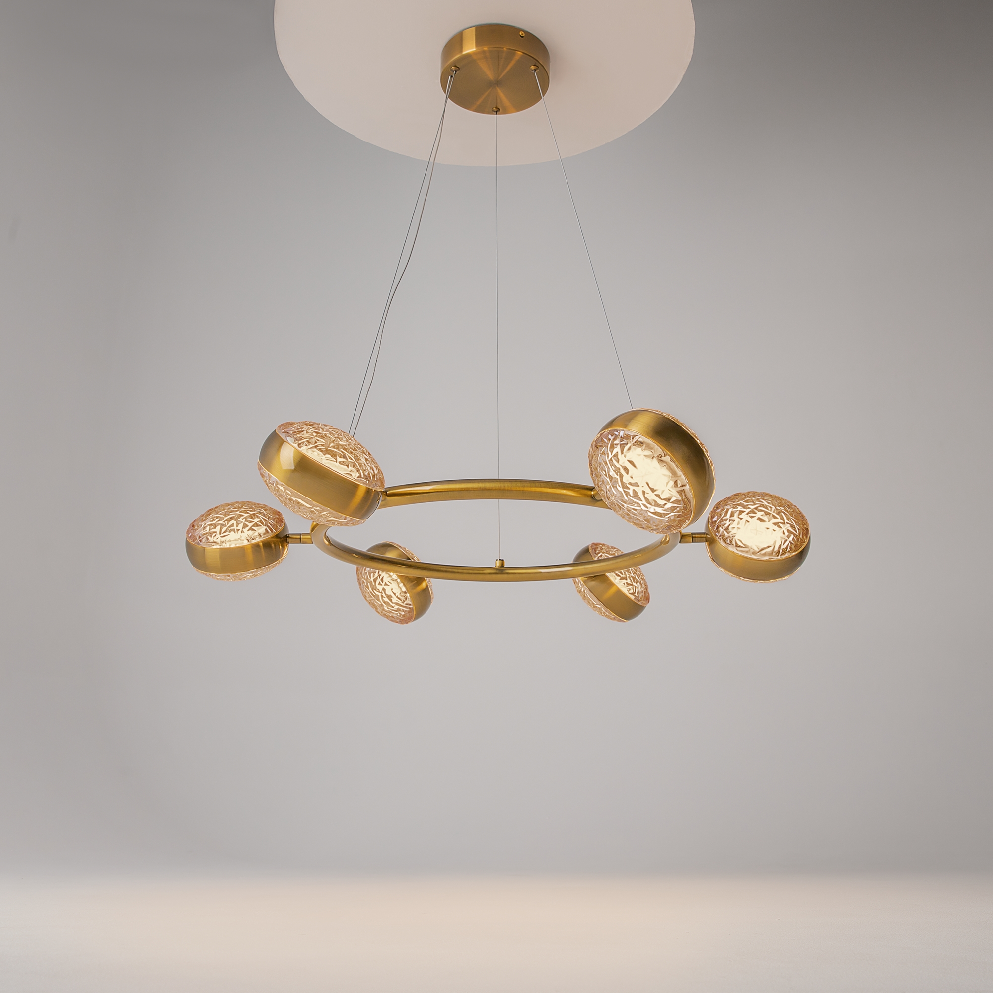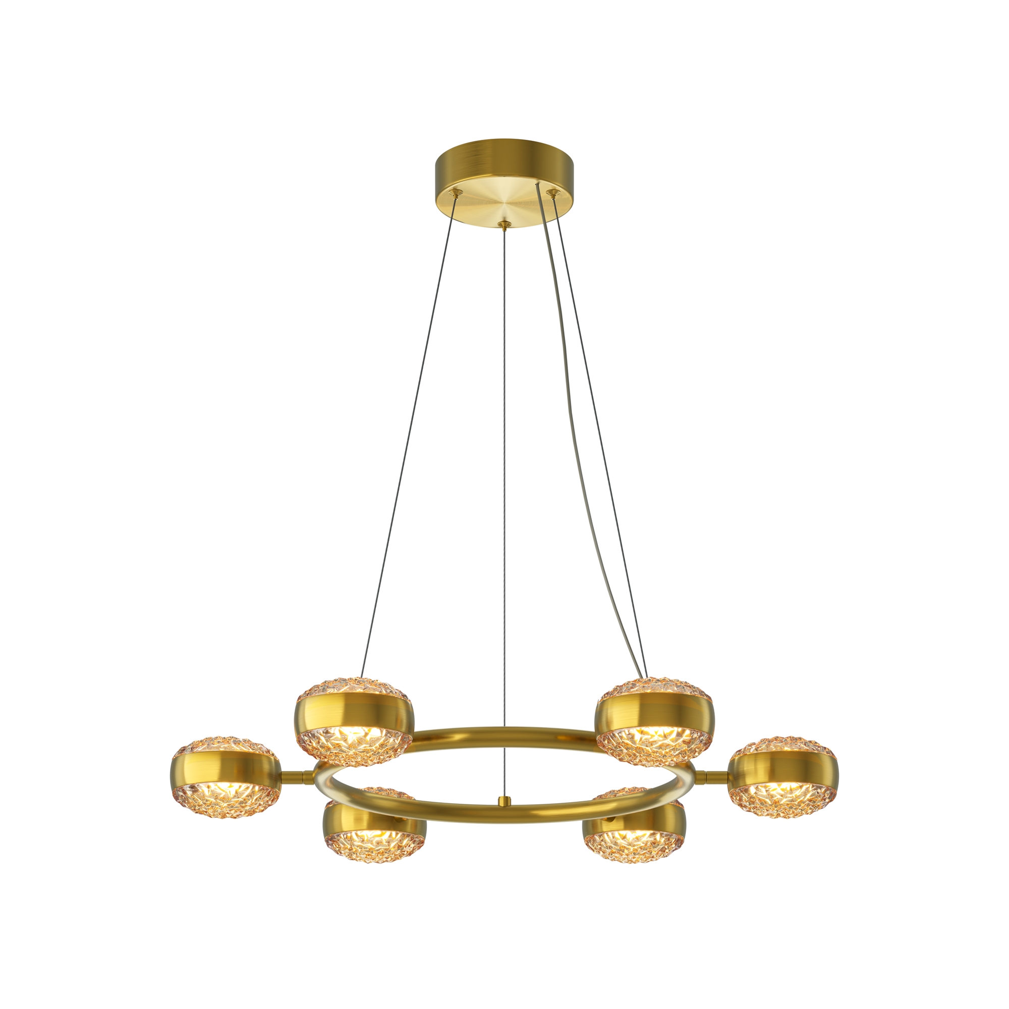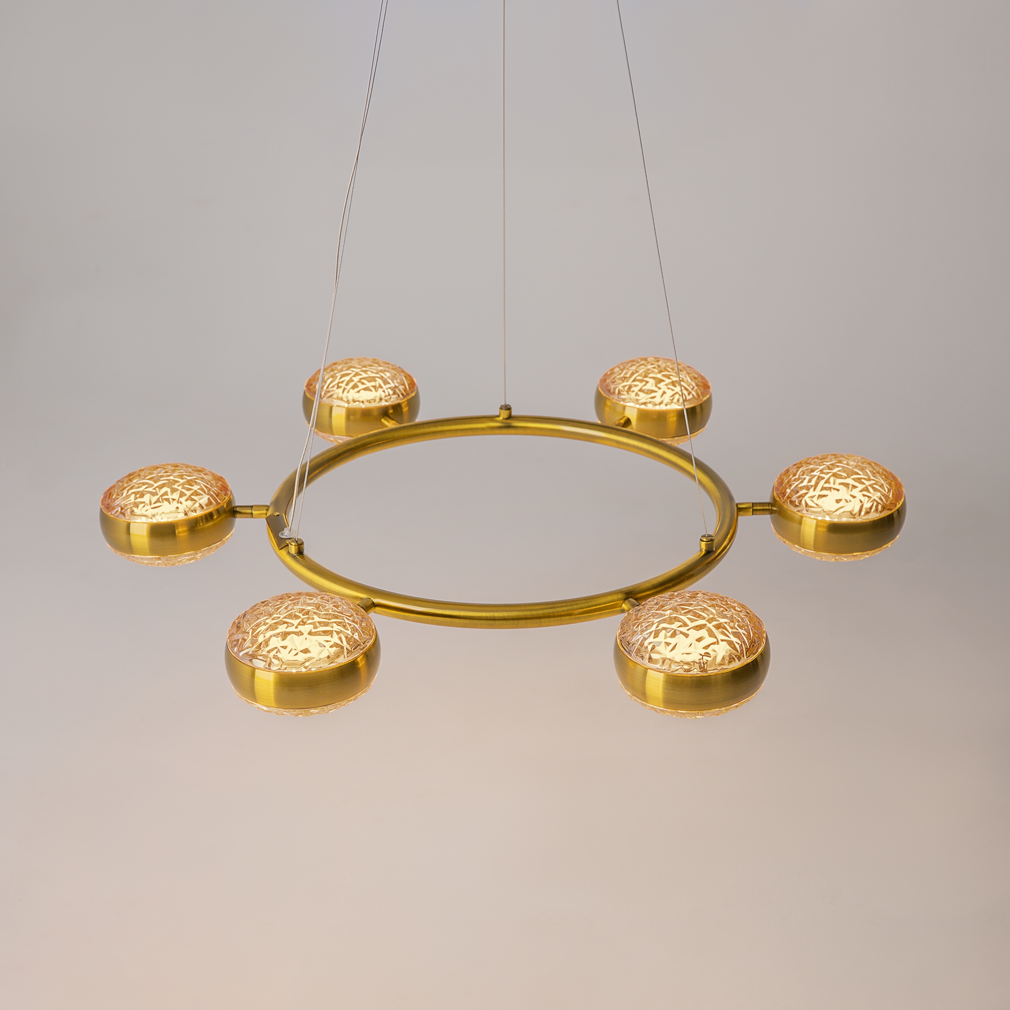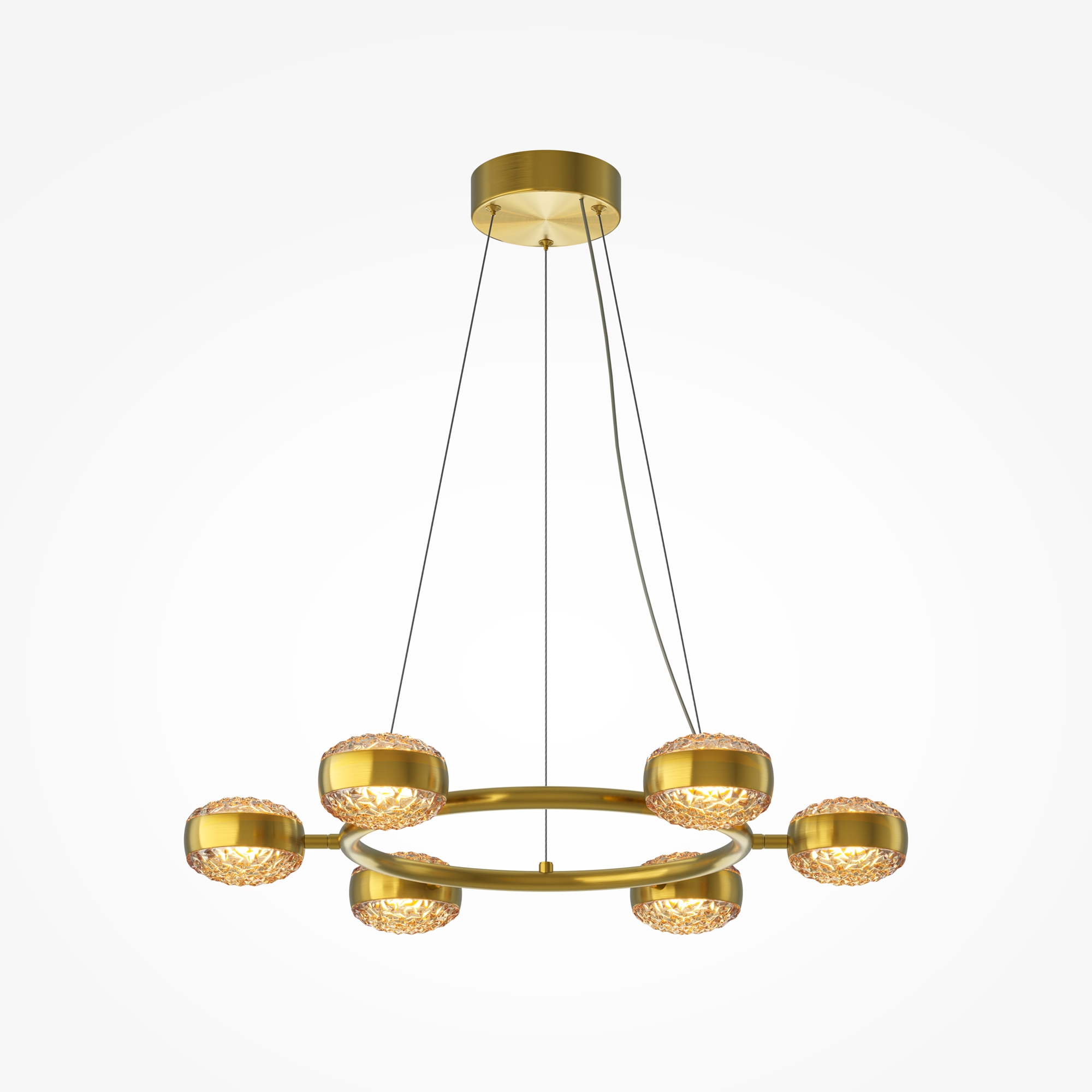Два цветовых сочетания: сатинированная арматура из металла в цвете латунь в комбинации со стеклянными плафонами янтарного оттенка или трендовый черный хром с глянцевым финишем в сочетании с тонированными светло-серыми плафонами. Источник света: LED. Цветовая температура 3000К, угол рассеивания 120 градусов. Провод длиной 3 м можно регулировать по высоте — светильник подходит для помещений с высокими потолками.