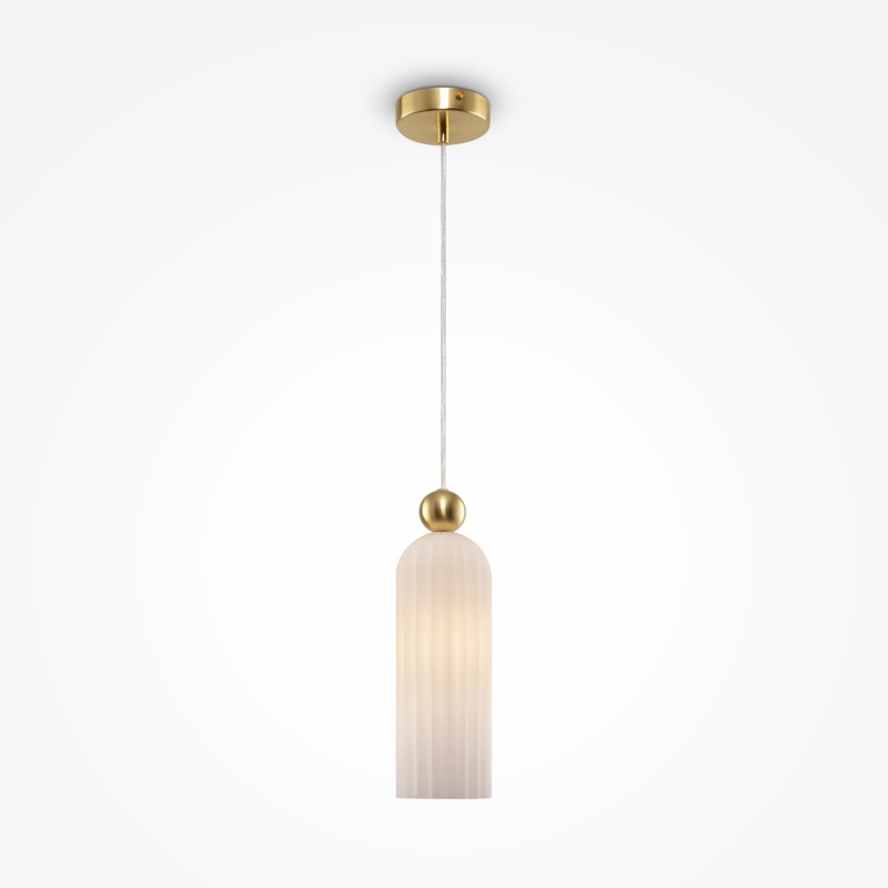 Металлическая арматура в цвете золота. Плафоны стеклянные нескольких цветов: коньячный, дымчатый, белый, серый. Источник света: цоколь Е14. Высота регулируется сегментами штанги или с помощью трехметрового провода. Серия применима в помещениях с высокими потолками. Поверхность стеклянных плафонов рифленая, усиливающая световые эффекты.