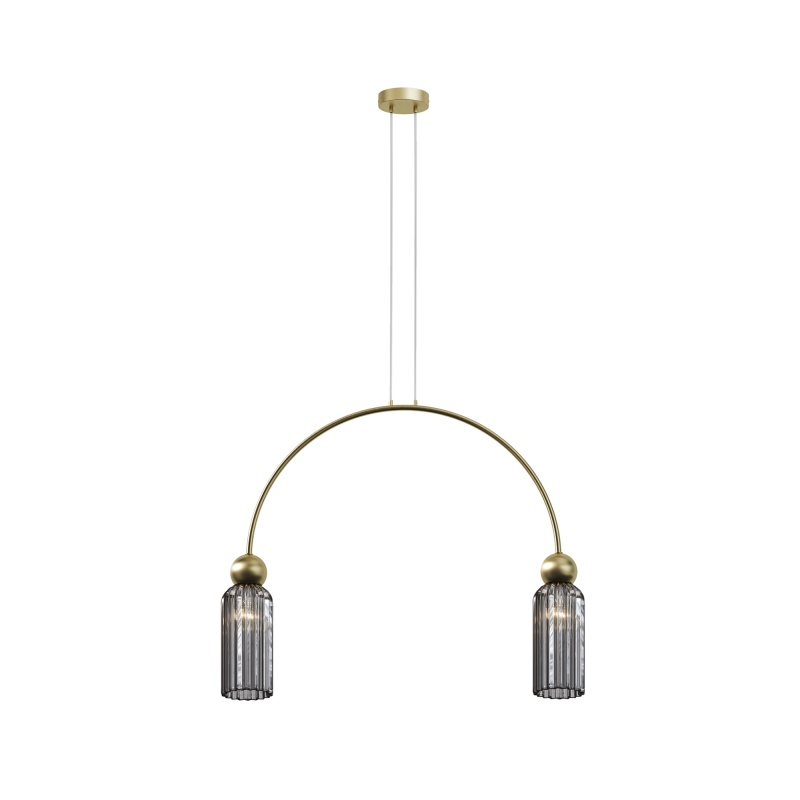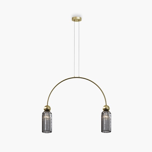 Металлическая арматура в цвете золота. Плафоны стеклянные нескольких цветов: коньячный, дымчатый, белый, серый. Источник света: цоколь Е14. Высота регулируется сегментами штанги или с помощью трехметрового провода. Серия применима в помещениях с высокими потолками. Поверхность стеклянных плафонов рифленая, усиливающая световые эффекты.