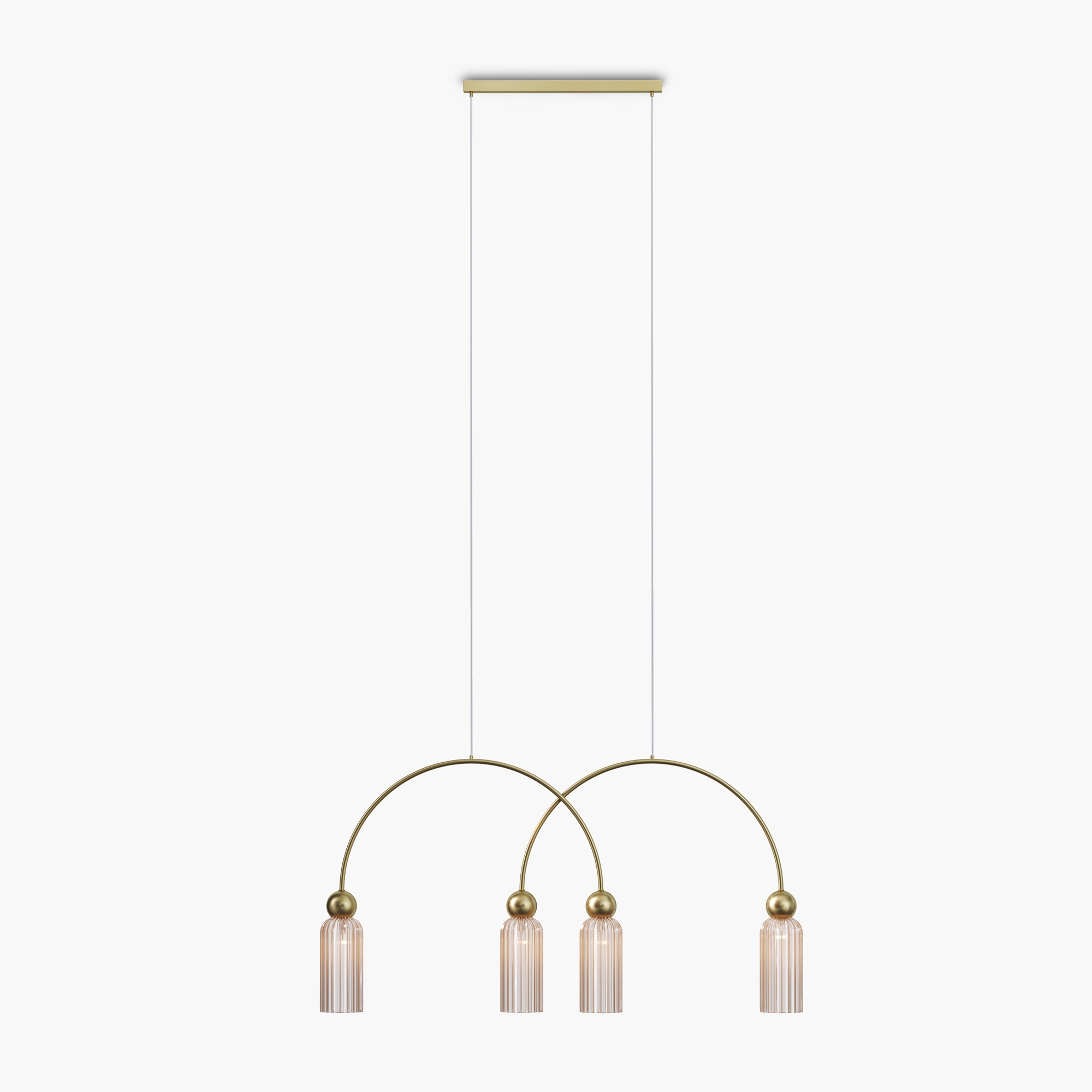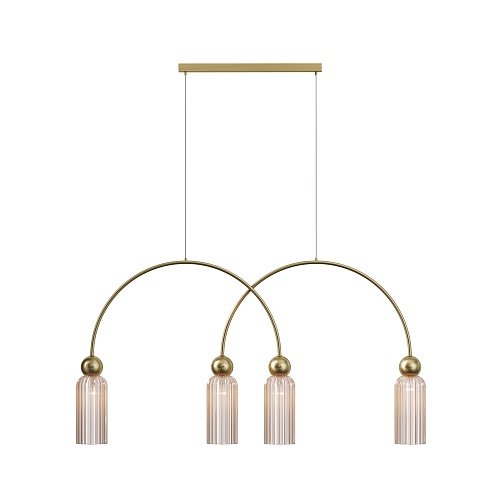 Металлическая арматура в цвете золота. Плафоны стеклянные нескольких цветов: коньячный, дымчатый, белый, серый. Источник света: цоколь Е14. Высота регулируется сегментами штанги или с помощью трехметрового провода. Серия применима в помещениях с высокими потолками. Поверхность стеклянных плафонов рифленая, усиливающая световые эффекты.