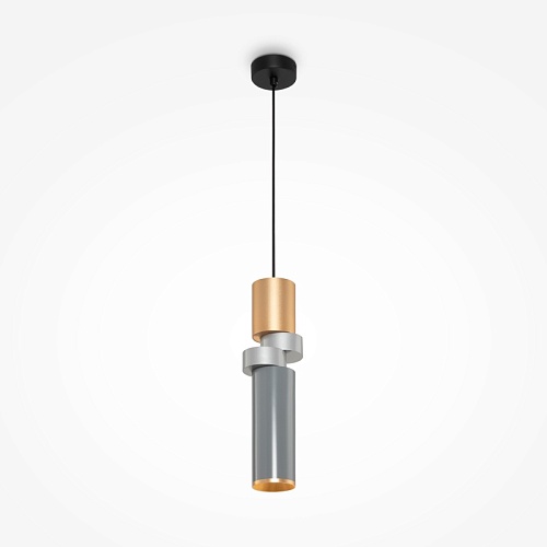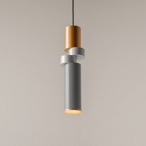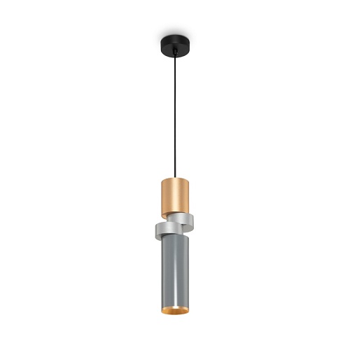 Металлическая арматура сочетает серый, золотой и серебряный цвет. Комбина ция цилиндрических форм в дизайне. Высота регулируется с помощью кабеля. Цоколь GU10