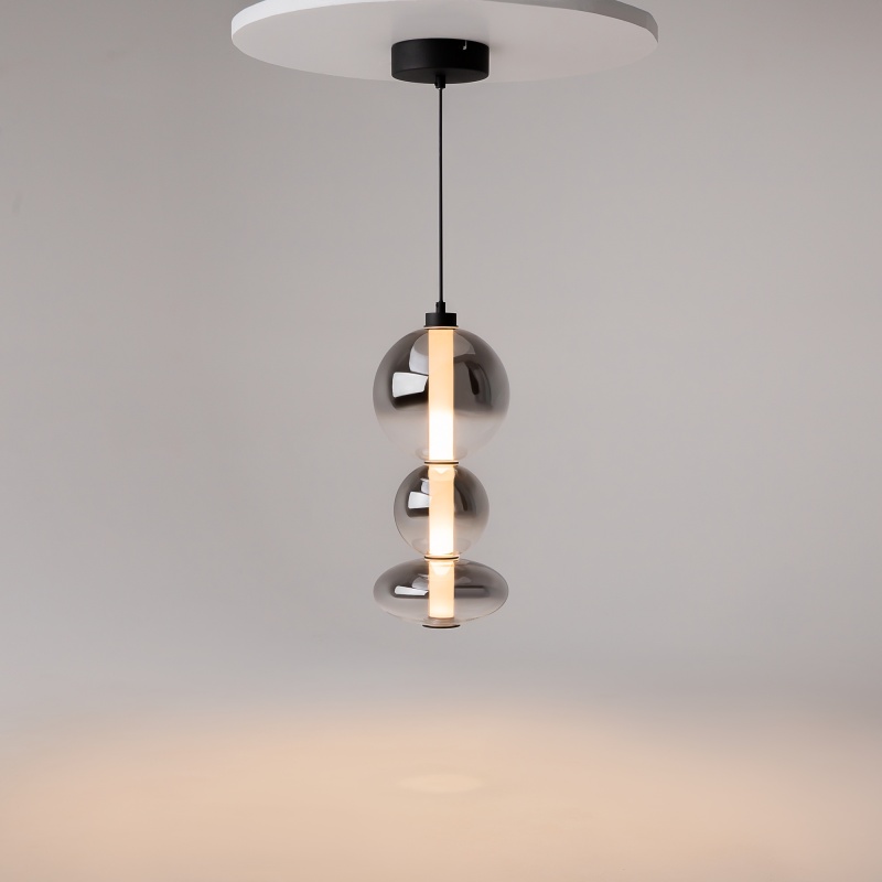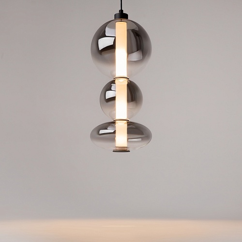 Светильники с тонированными выдувными стеклянными плафонами (дымчатыми или янтарными) и металлической арматурой (черной или цвета латуни). Окрашивание плафонов градиентное. Источник света: LED. Световой элемент установлен внутри акрилового рассеивателя. Цветовая температура источника света – 3000К, угол рассеивания — 120°. Торшеры снабжены Push-кнопкой на проводе.