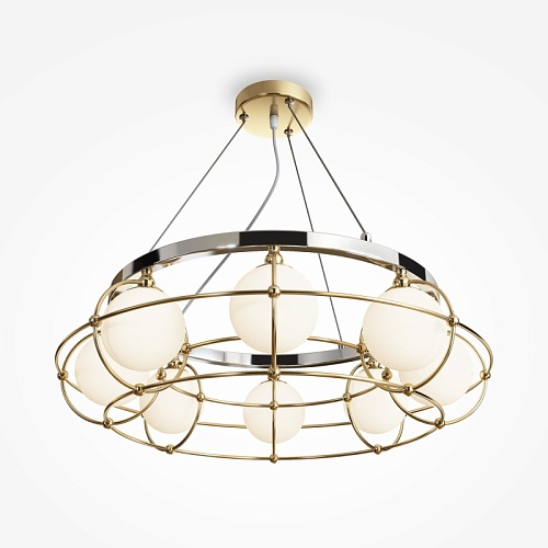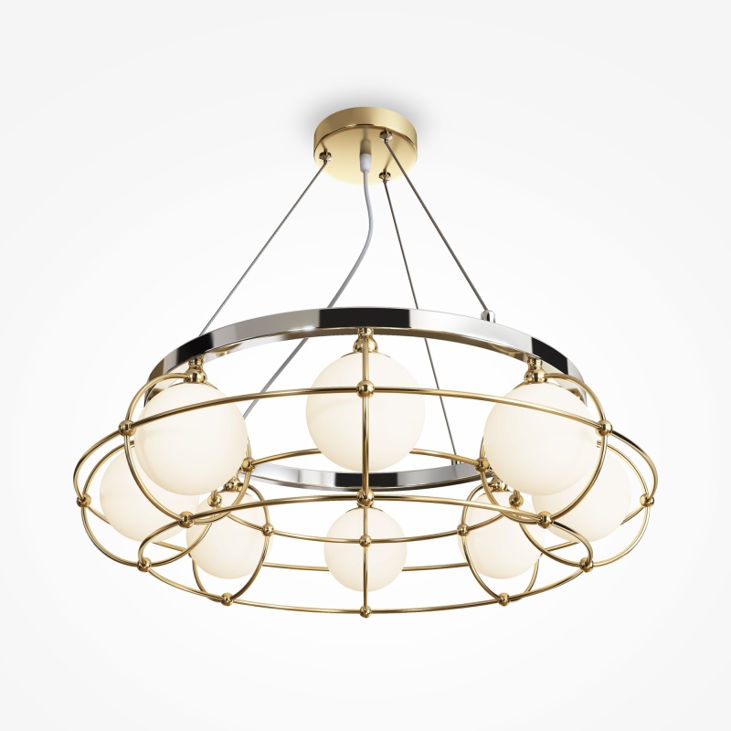 Металлическая арматура сочетает два цвета: хром и золото. Плафоны из белого выдувного стекла. Каждый световой элемент заключен в металлический каркас. Регулируемая высота. Цоколь G9.