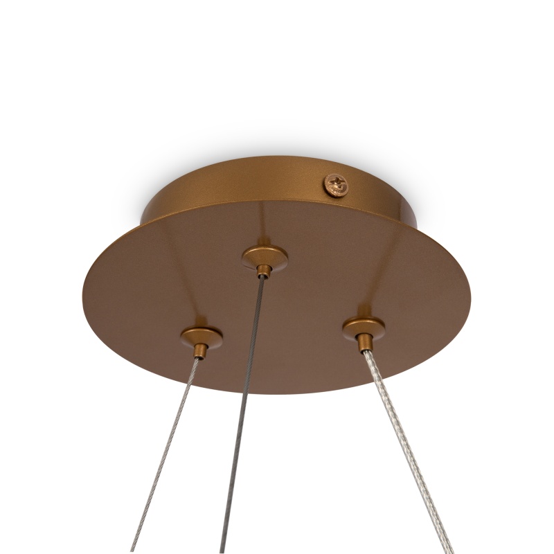Арматура из металла в двух оттенках: черный и золото. Плафоны из матового выдувного стекла крепятся к металлическим дугам. Высота регулируется с помощью тросов.