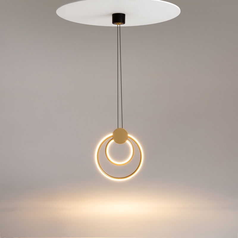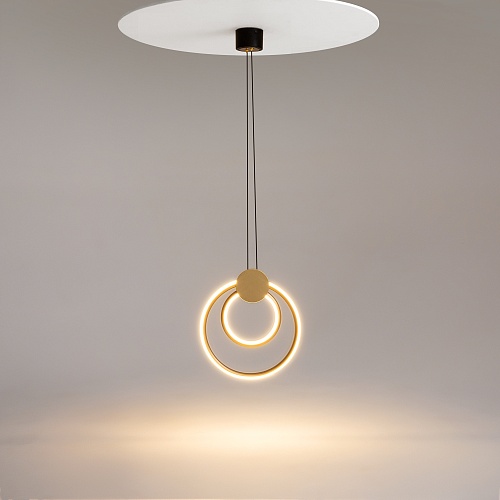Серия Link представлена подвесными и настенными светильниками с разной вариацией светодиодных колец. Арматура - из металла в цвете латунь с чёрными элементами. Источник света — LED-кольца. Цветовая температура — 3000 K. Угол рассеивания — 125 градусов. Провод регулируемый, 3 метра.