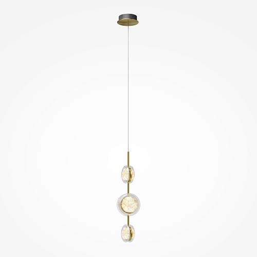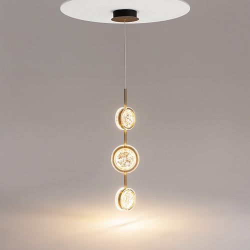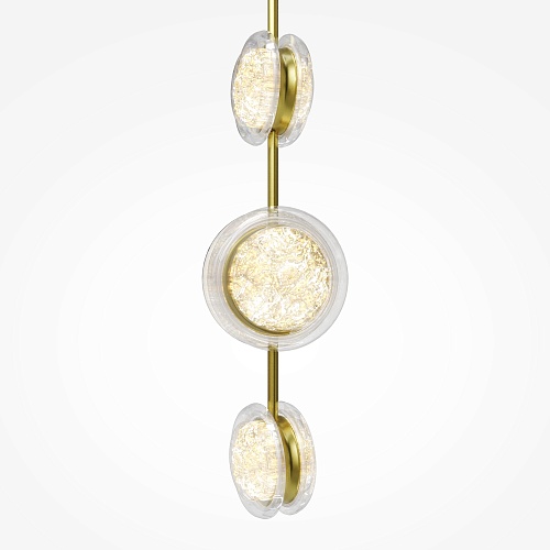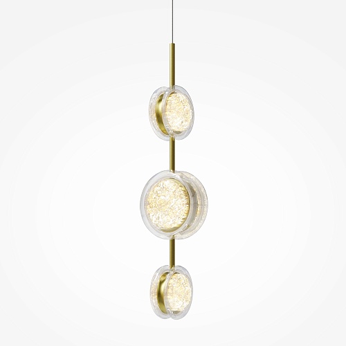 Арматура из металла цвета латунь с сатинированным финишным покрытием сочетается с прозрачными плафонами. Подвесные одинарные, горизонтальный и каскадные светильники оснащаются LED-модулем с двумя плоскими плафонами из акрила со сложным, актуальным паттерном на поверхности. Цветовая температура — 3000К, угол рассеивания — 125 градусов.