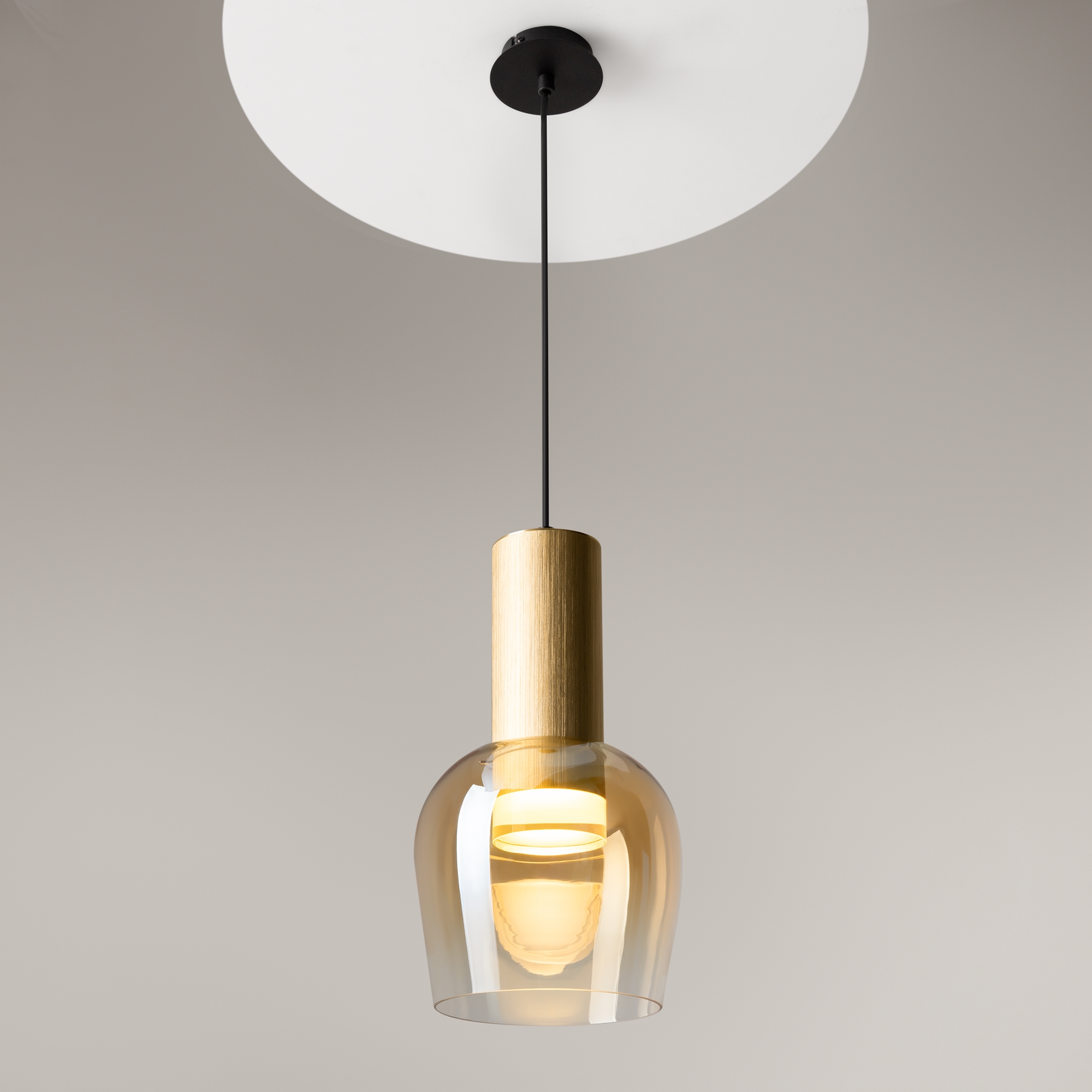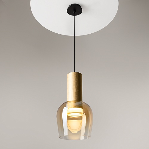 Цветовая гамма: дымчато-серый или насыщенно-янтарный цвет стекла в сочетании с черной или золотой арматурой. В серии есть модели светильников со сменным источником света с цоколем Е27 (каскадная композиция, потолочный и настольные светильники) и LED-источником (одинарные подвесные светильники). Температура свечения LED – 3000 К, угол рассеивания — 120 градусов. Плафоны каскадной композиции плафоны разных размеров и оттенков, установленные на одно основание. Оригинальный декор — актуальный вариант современной классики.