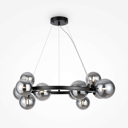 Металлическая арматура в четырех цветах: матовый черный, хром, золото, латунь. Плафоны — выдувное стекло. Цвета — дымчатый, янтарный, коньячный. Дизайн с имитацией молекулярной структуры. Высота подвесных светильников регулируется тросом. Лампа с цоколем G9.