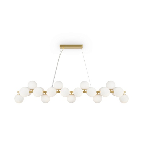 Металлическая арматура в четырех цветах: матовый черный, хром, золото, латунь. Плафоны — выдувное стекло. Цвета — дымчатый, янтарный, коньячный. Дизайн с имитацией молекулярной структуры. Высота подвесных светильников регулируется тросом. Лампа с цоколем G9.