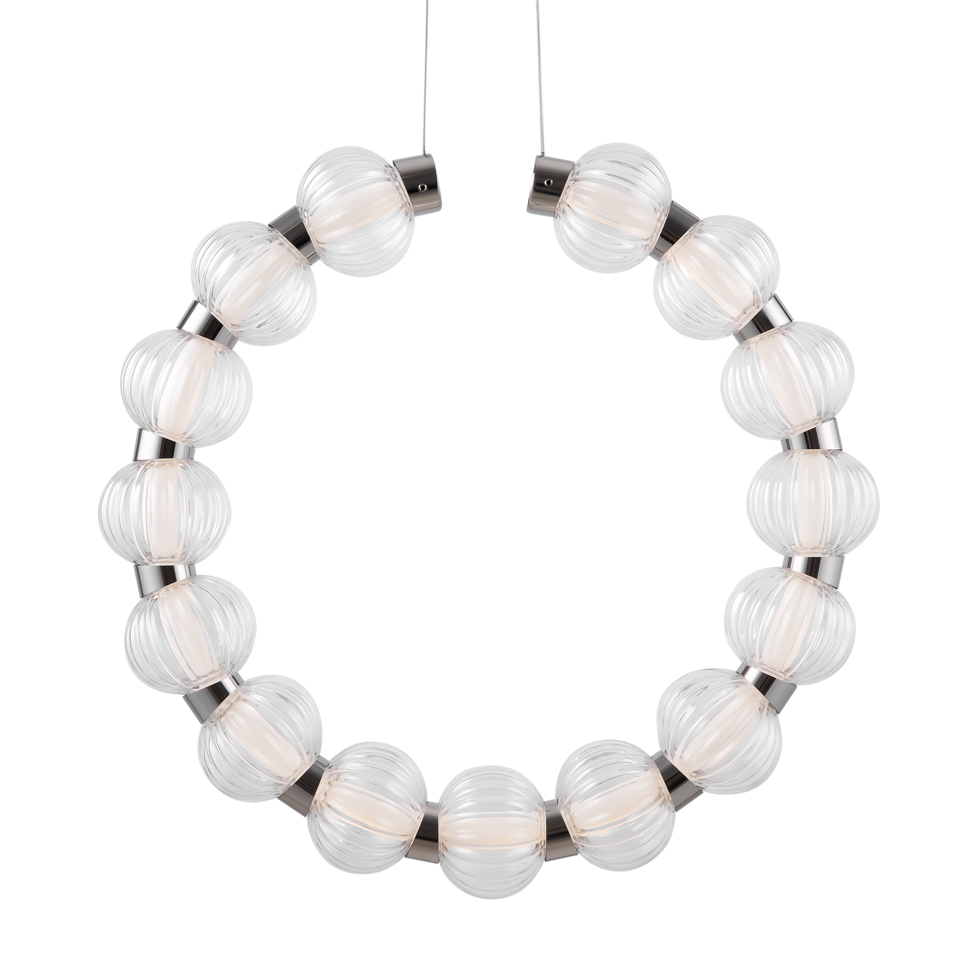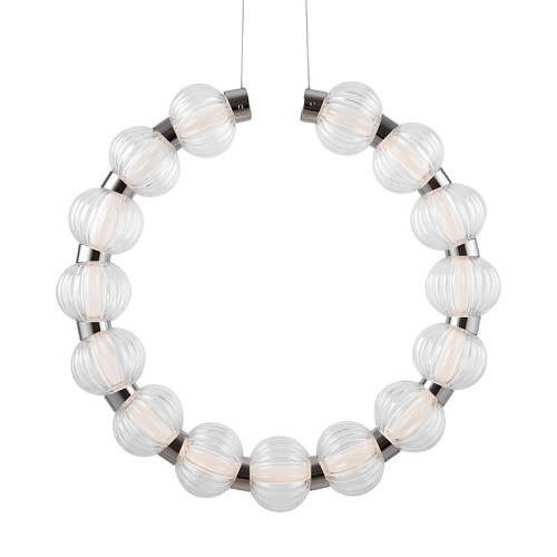 Арматура из металла, цвет – хром. Акцентный декор в виде рельефных сфер из литого стекла. Источник света – светодиодная лента – скрыта под акриловым рассеивателем. Регулируемая высота подвесных светильников.