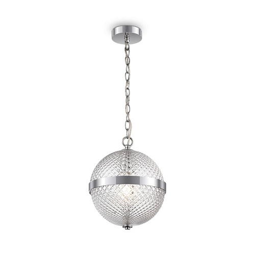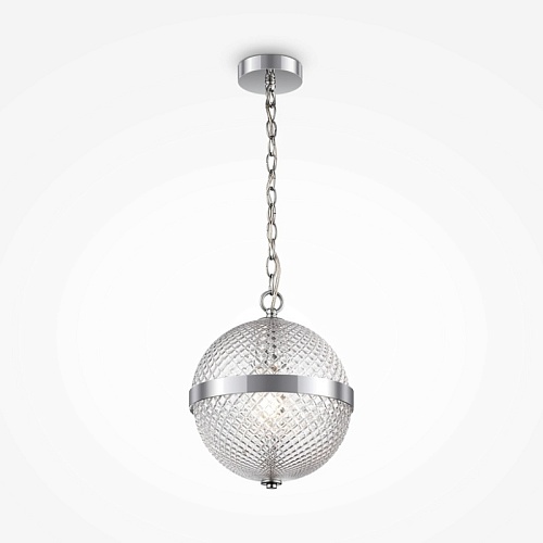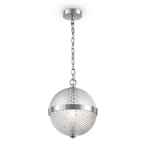 Арматура – металл, цвет – хром. Плафон – прозрачное выдувное стекло. Сферическая форма с фактурным рисунком. Регулируемая высота.