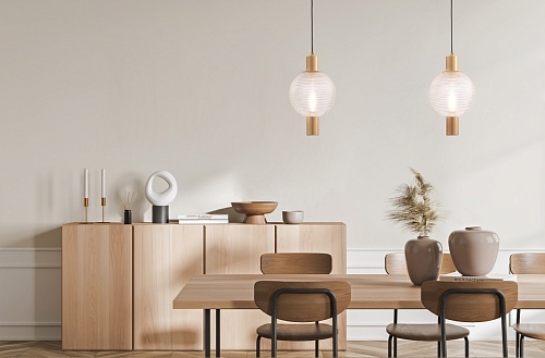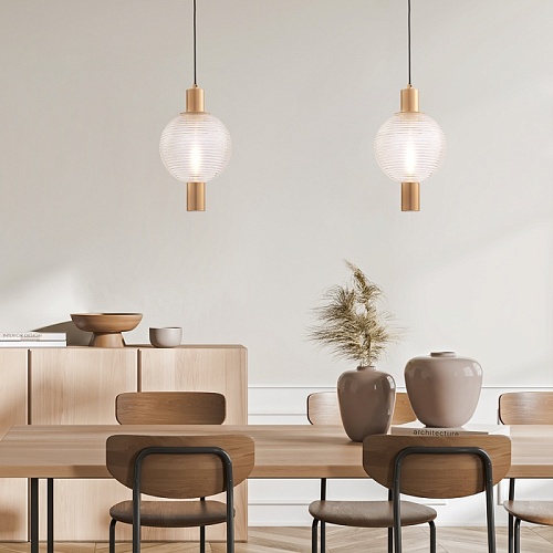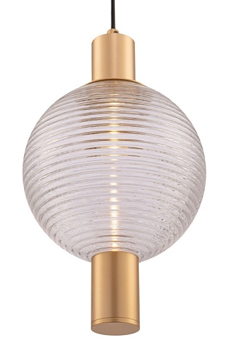Арматура из металла, оттенки – никель, латунь, матовый черный. Плафон-сфера из прозрачного стекла с рельефным рисунком. Источник света установлен в металлическом корпусе сверху. Регулируемая высо