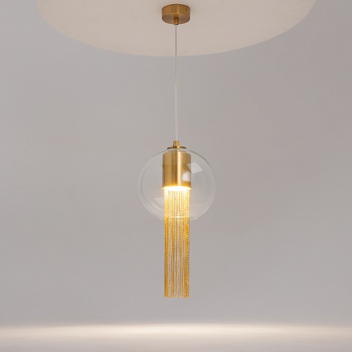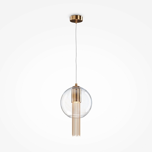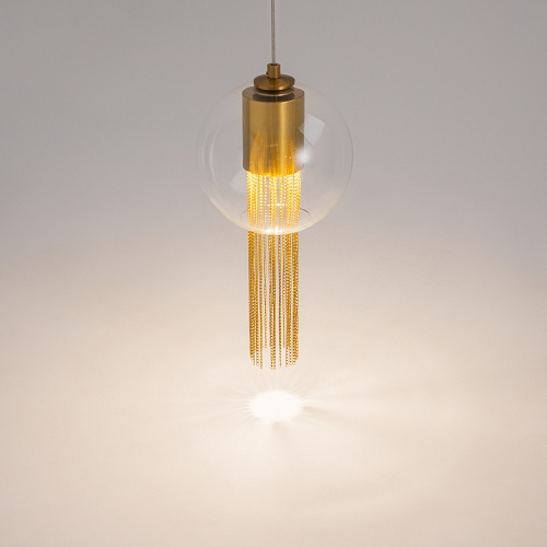 Металлическая арматура в бронзовом оттенке. Плафон-сфера – прозрачное выдувное стекло. Декор – подвесные цепочки внутри плафона. Скрытый источник света.