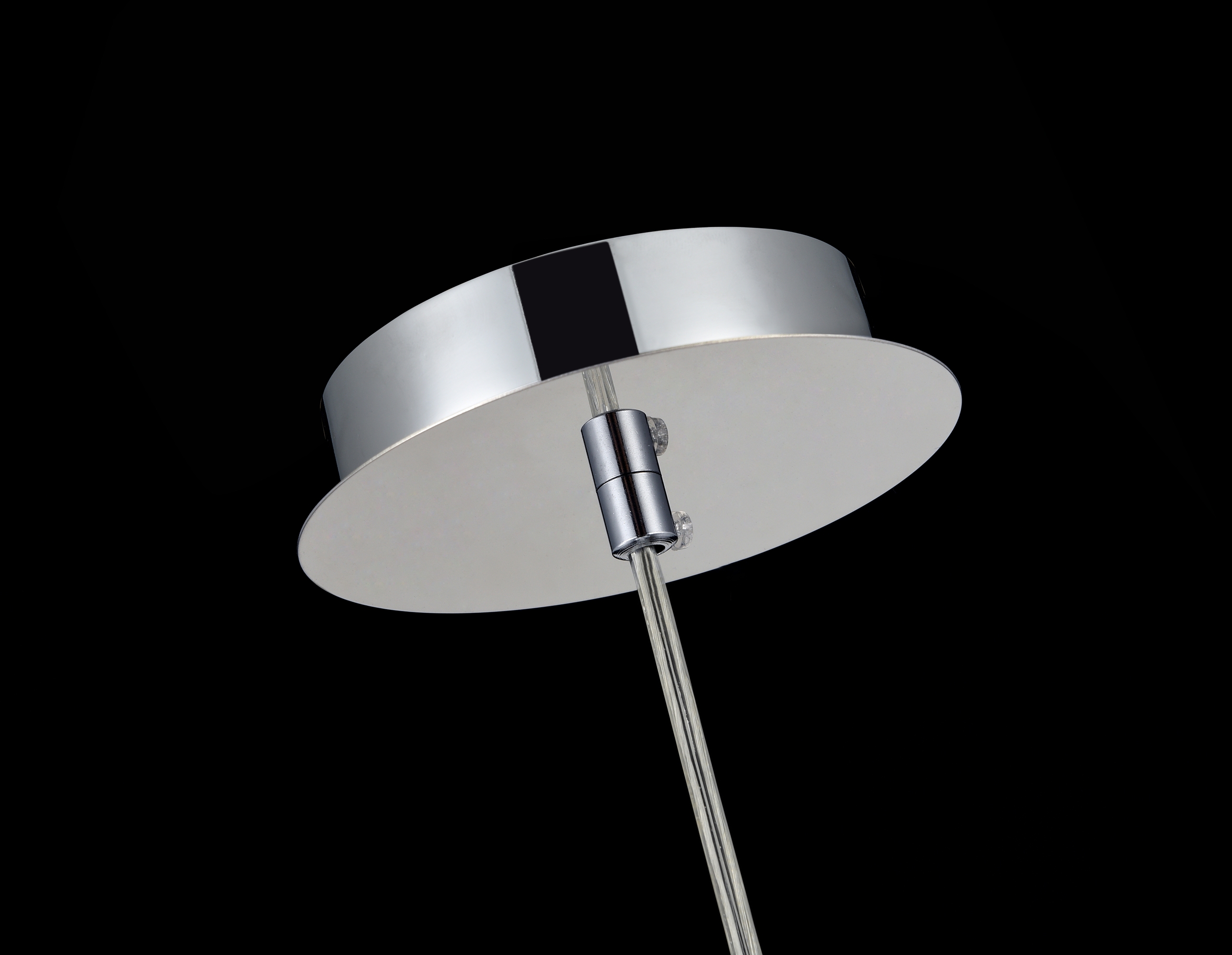 Арматура из металла в двух оттенках: никель и золото. Часть плафона выполнена из металла в тон арматуре, другая часть — из прозрачного стекла. Декоративные подвески внутри плафонов. Регулируемая высота.