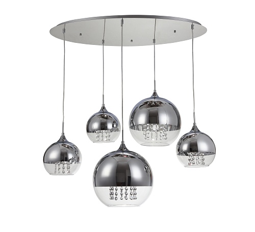 Арматура из металла в двух оттенках: никель и золото. Часть плафона выполнена из металла в тон арматуре, другая часть — из прозрачного стекла. Декоративные подвески внутри плафонов. Регулируемая высота.