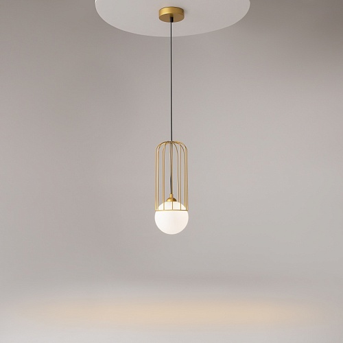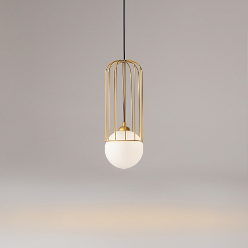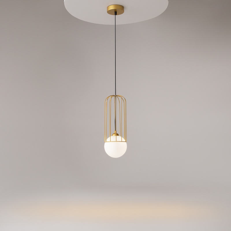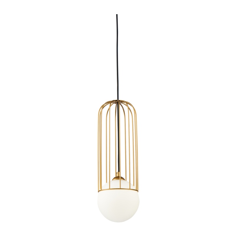 Арматура из металла в золотом цвете. Плафон из матового белого стекла. Декор плафона Telford — решетка из стальной проволоки в тон арматуре. Регулируемая высота.