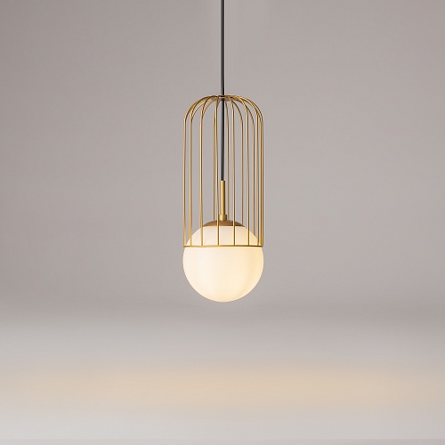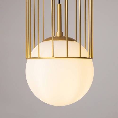 Арматура из металла в золотом цвете. Плафон из матового белого стекла. Декор плафона Telford — решетка из стальной проволоки в тон арматуре. Регулируемая высота.