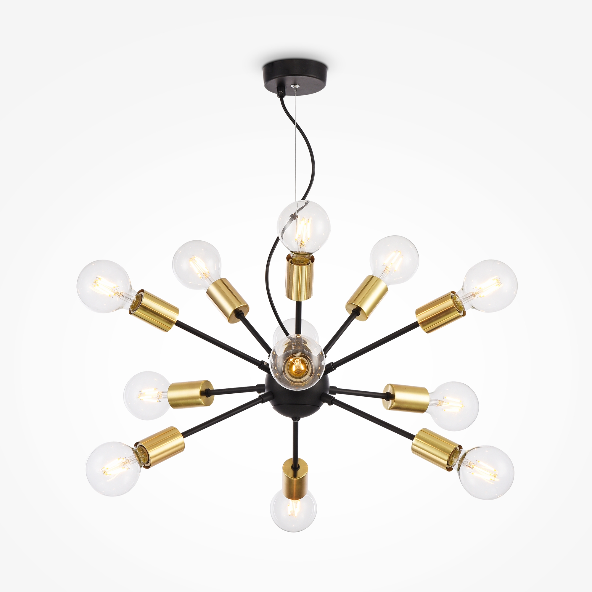 Арматура — металл, цвет — черный. Декоративные колпачки оттенка латуни. Индустриальная стилистика. Высота регулируется тросом.