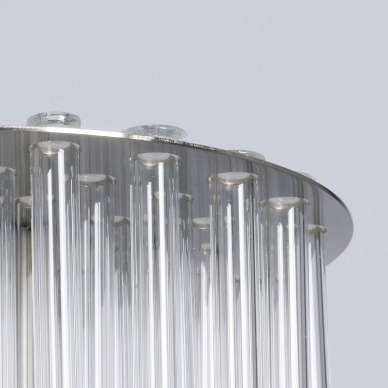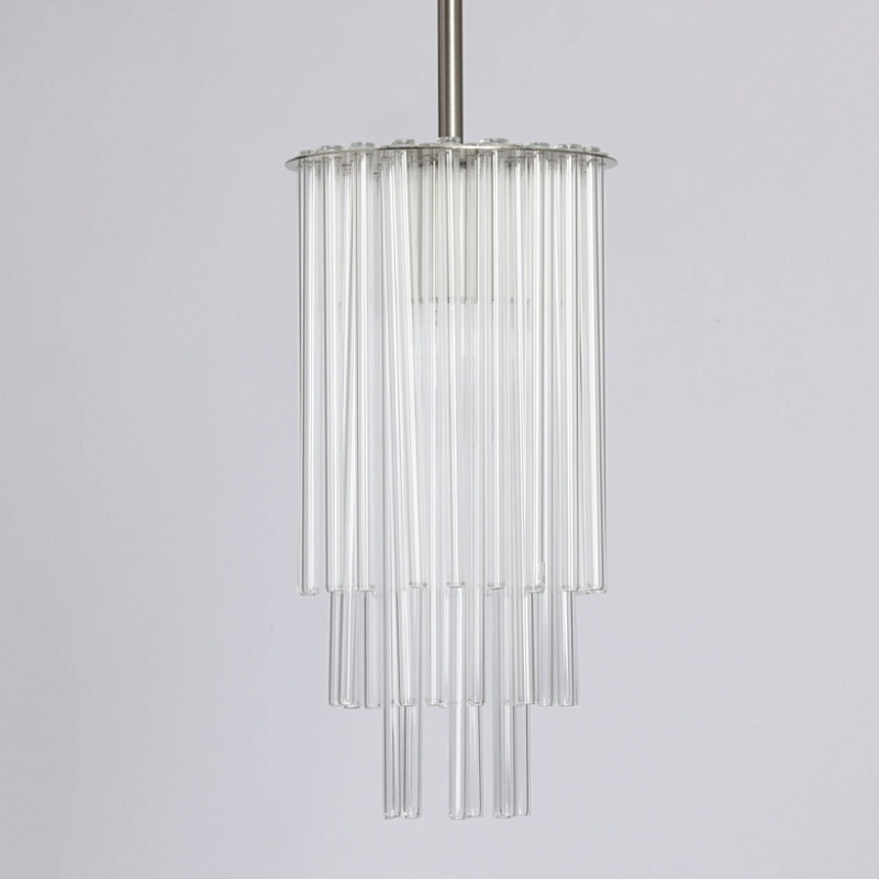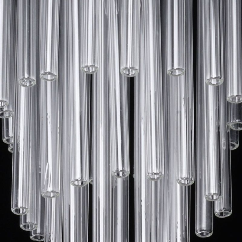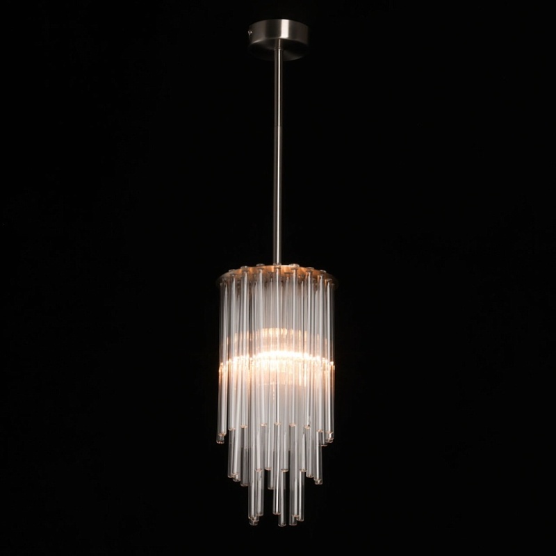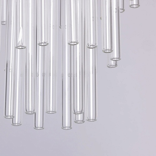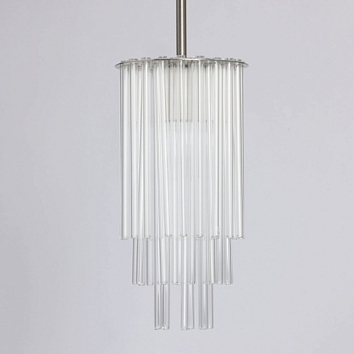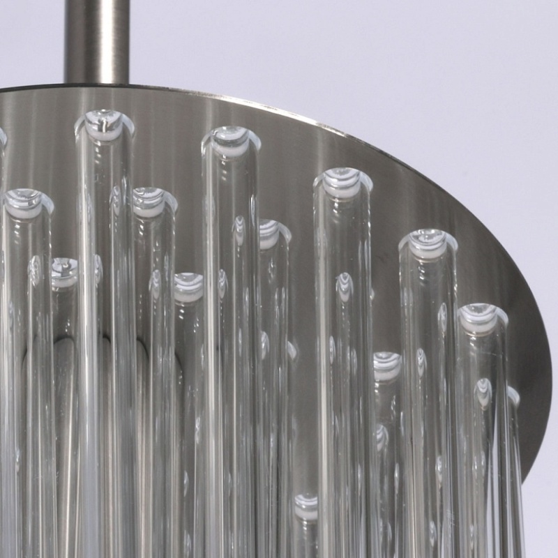 Металлическое основание подвесной люстры гальванизировано в цвет никеля. Светильник декорирован прозрачными стеклянными трубочками.