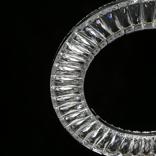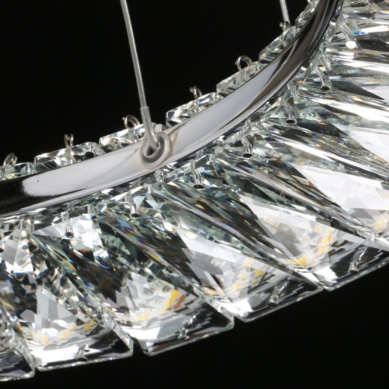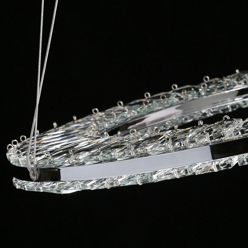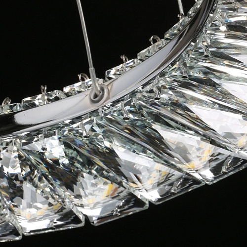 Металлическое основание светильника гальванизировано в цвет хрома. Потолочная чаша подвесной люстры закрыта листом нержавеющей стали, отполированной до зеркального блеска. Светильник декорирован прозрачным хрусталем прямоугольной формы со сложной огранкой.