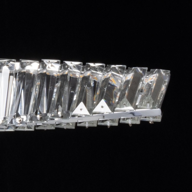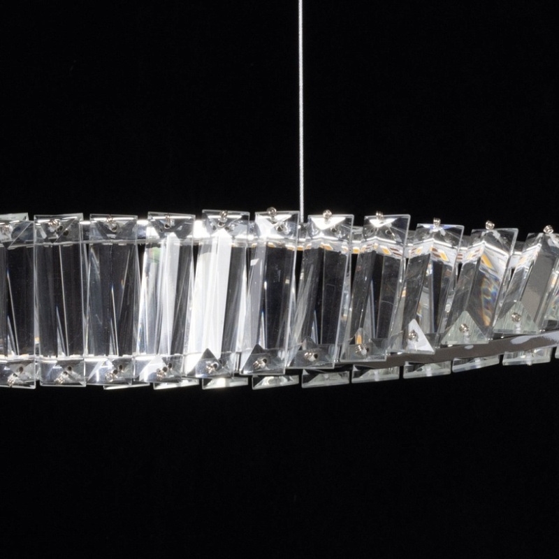 Металлическое основание подвесной люстры гальванизировано в цвет хрома. Люстра декорирована прозрачным хрусталем.