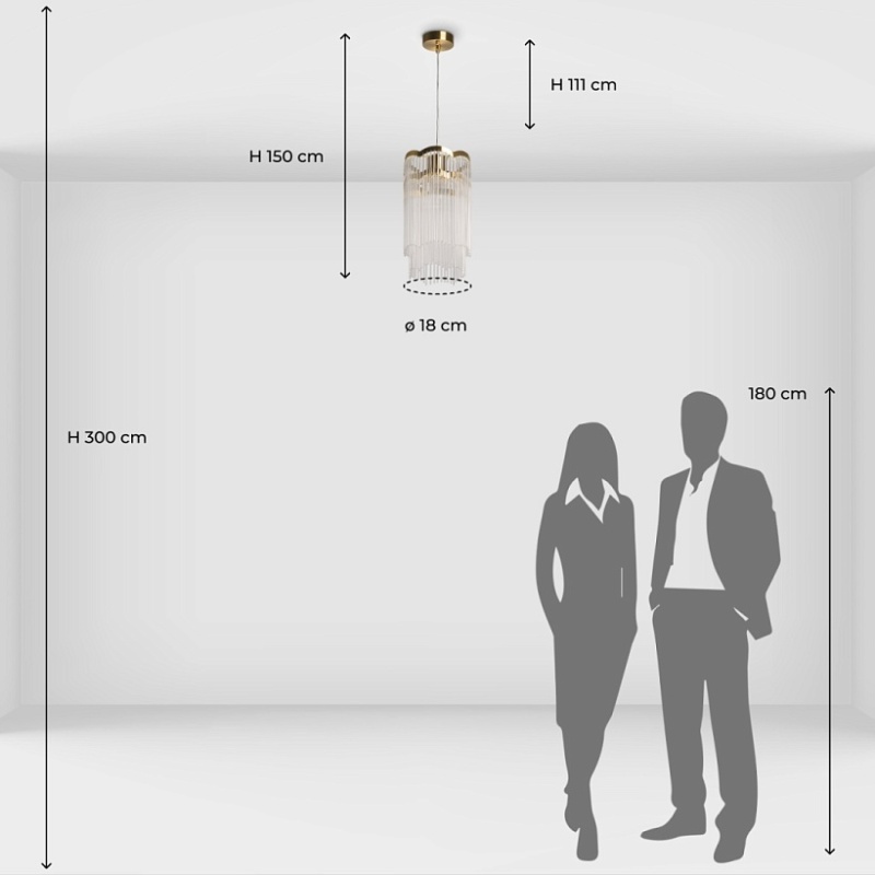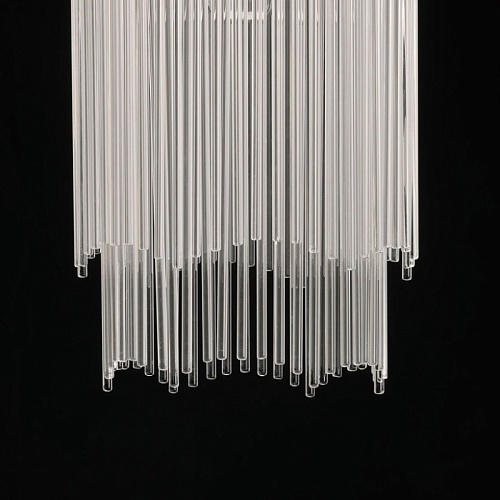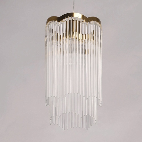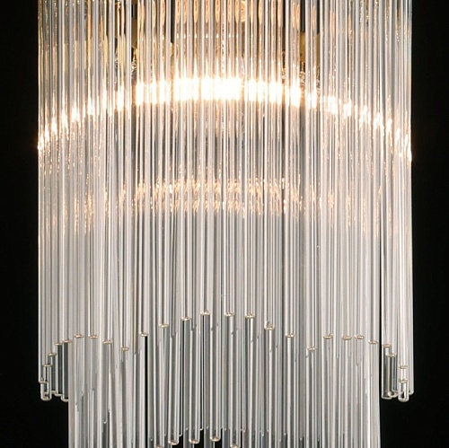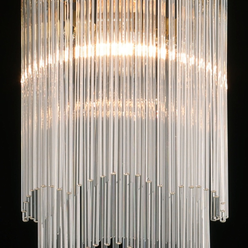 Металлическое основание потолочной люстры гальванизировано в цвет латунь. Люстра декорирована прозрачными стеклянными трубочками.