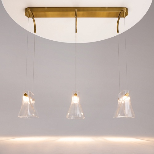 Цвет металлической арматуры — латунь с сатинированным финишем, плафоны — прозрачное стекло. Источник света: LED. Цветовая температура светильников 3000К, угол рассеивания — 120 градусов. Настенные бра и подвесные светильники оснащены регулируемым проводом длиной до 3 метров, что позволяет использовать их в помещениях с высокими потолками.