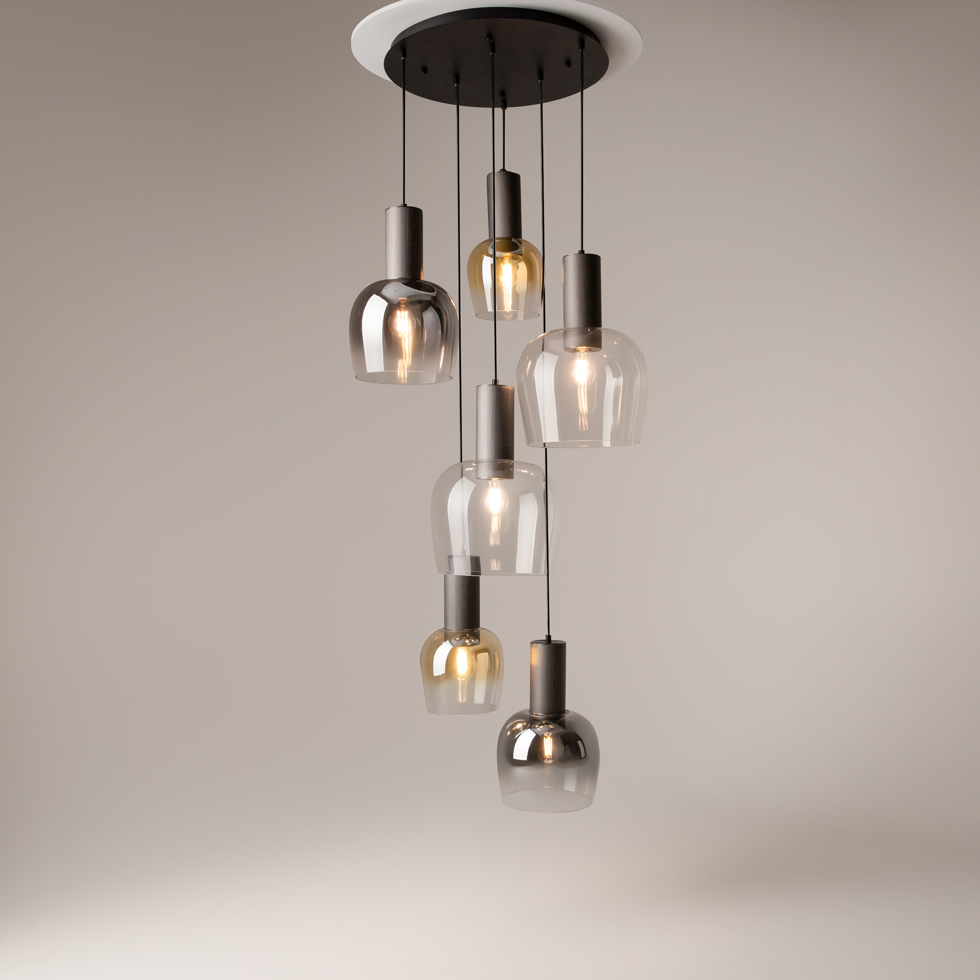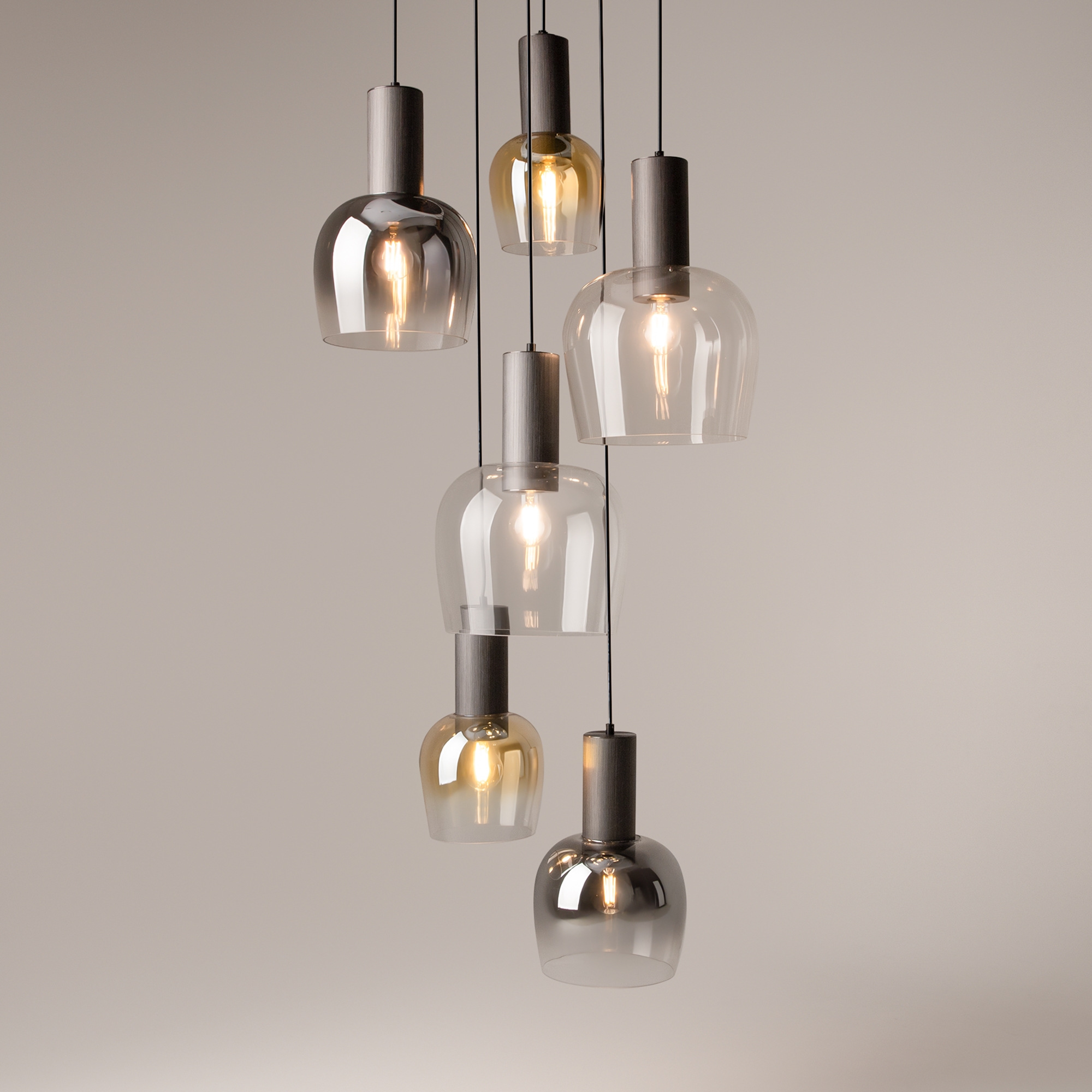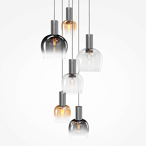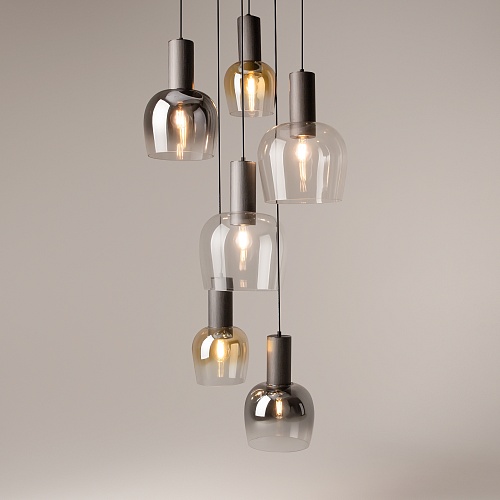 Цветовая гамма: дымчато-серый или насыщенно-янтарный цвет стекла в сочетании с черной или золотой арматурой. В серии есть модели светильников со сменным источником света с цоколем Е27 (каскадная композиция, потолочный и настольные светильники) и LED-источником (одинарные подвесные светильники). Температура свечения LED – 3000 К, угол рассеивания — 120 градусов. Плафоны каскадной композиции плафоны разных размеров и оттенков, установленные на одно основание. Оригинальный декор — актуальный вариант современной классики.