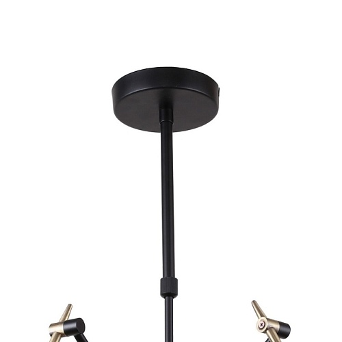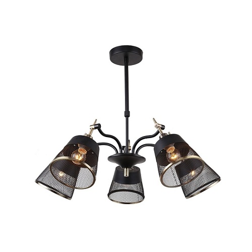 Металлический каркас черного цвета с декоративными элементами в цвете латунь, плафоны из перфорированного металла черного цвета, регулируемая высота, сменные лампы.