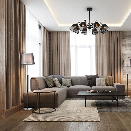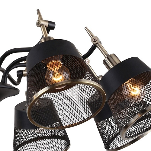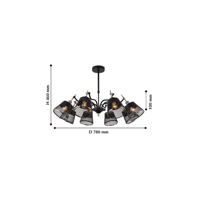Металлический каркас черного цвета с декоративными элементами в цвете латунь, плафоны из перфорированного металла черного цвета, регулируемая высота, сменные лампы.