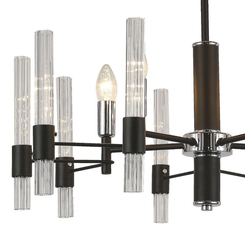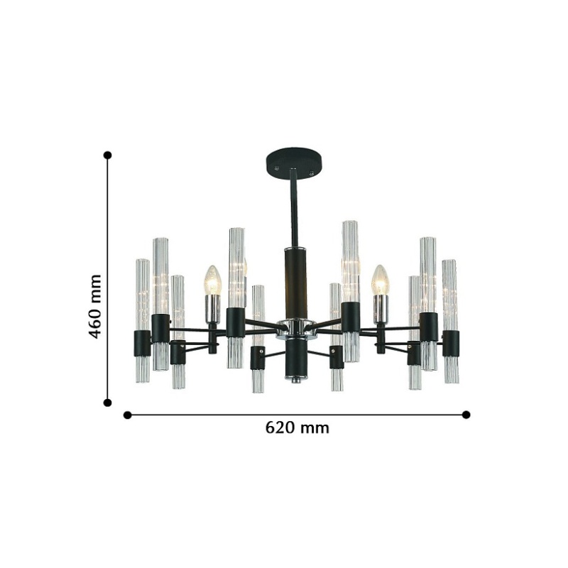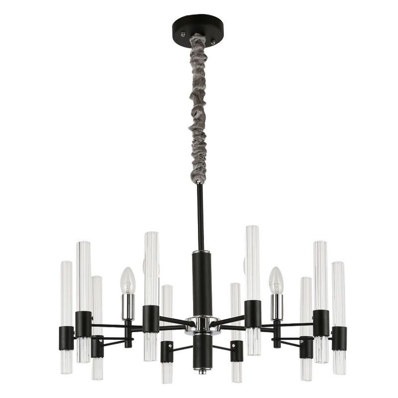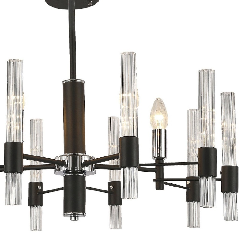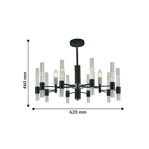 Металлический каркас черного цвета, хромированный декоративный элемент, рифленые плафоны из прозрачного стекла.