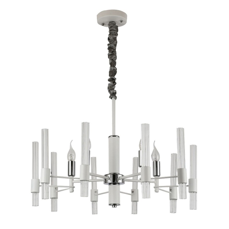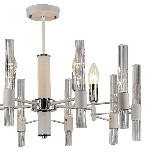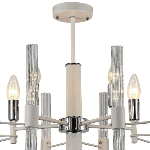 Металлический каркас белого цвета, хромированный декоративный элемент, рифленые плафоны из прозрачного стекла.
