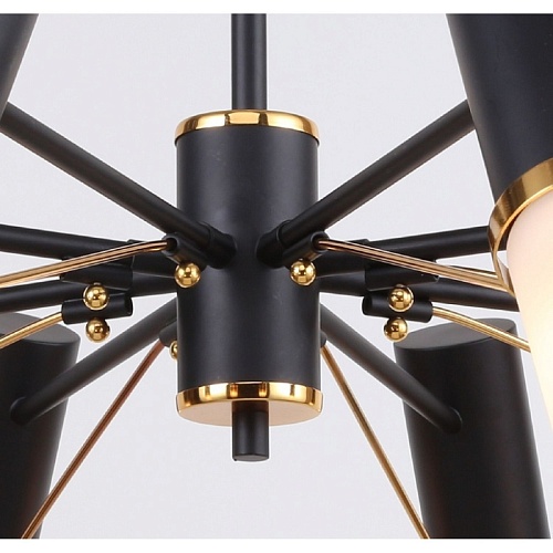 Металлический каркас черного цвета с декоративными элементами золотого цвета, плафоны из белого матового стекла.