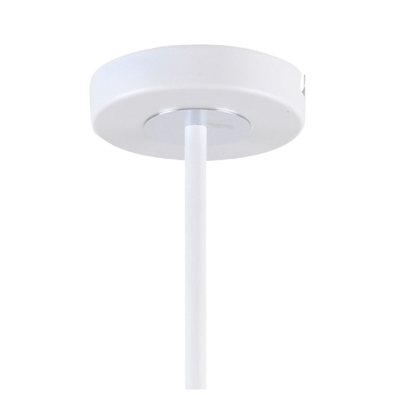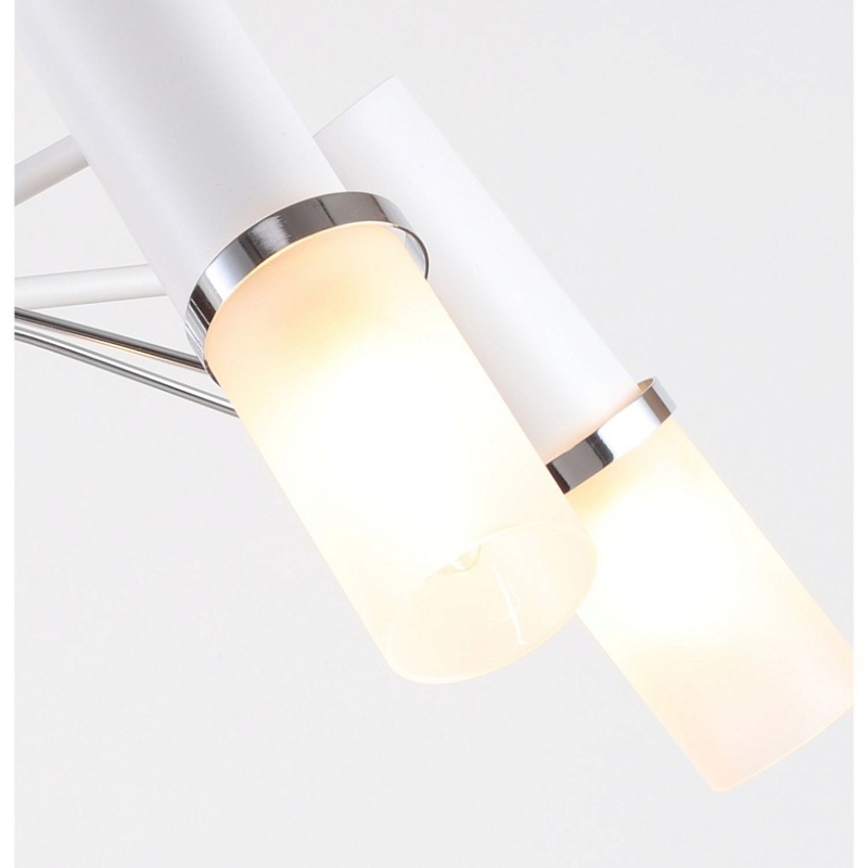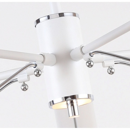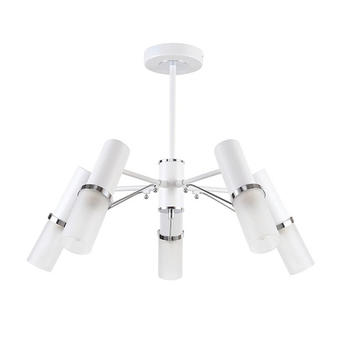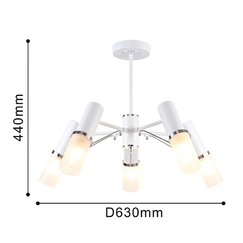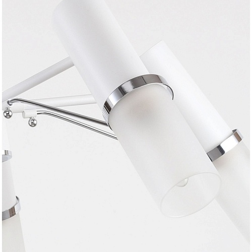 Металлический каркас белого цвета с декоративными элементами золотого цвета, плафоны из белого матового стекла.