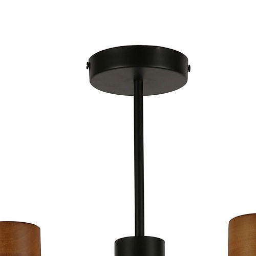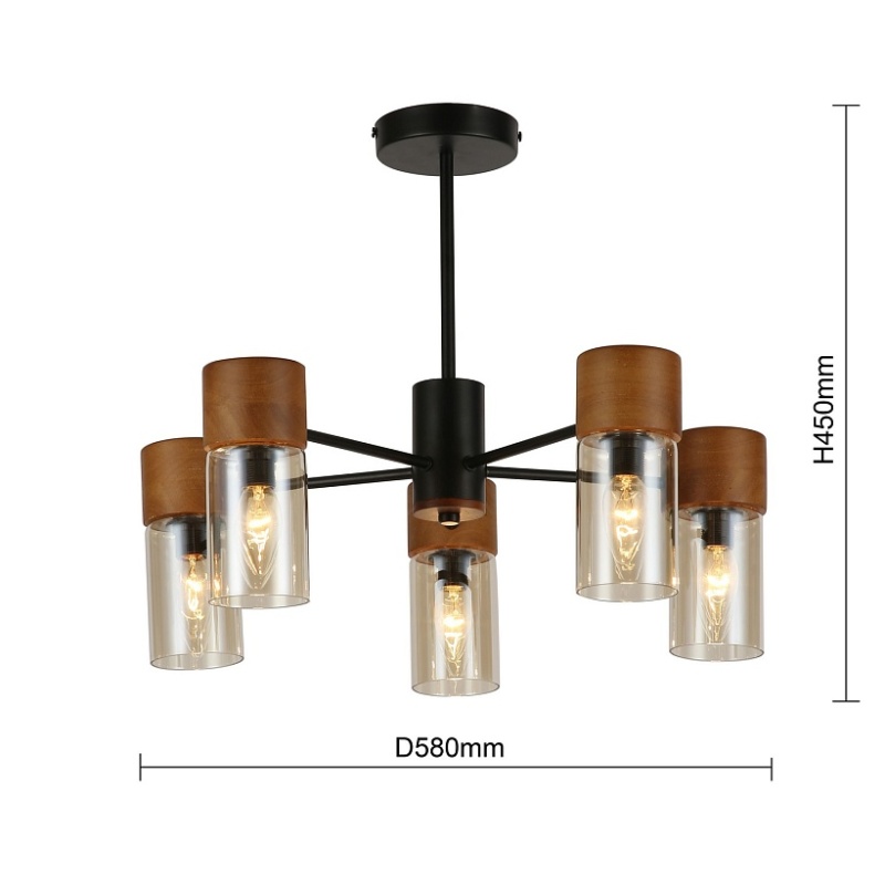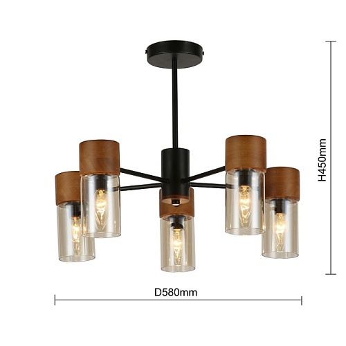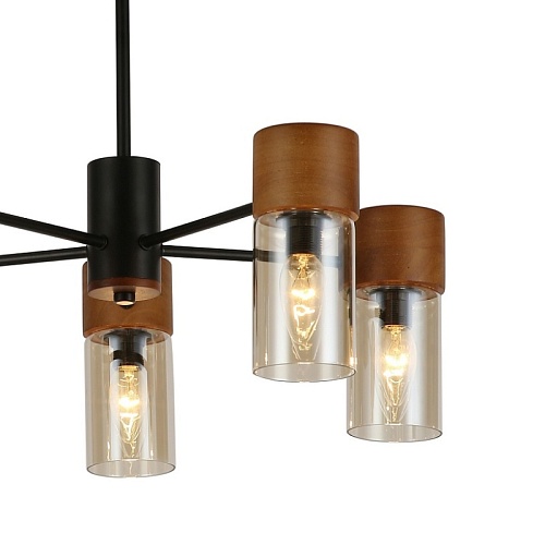 Каркас черного цвета с декоративными элементами из дерева, плафон из прозрачного стекла коньячного оттенка