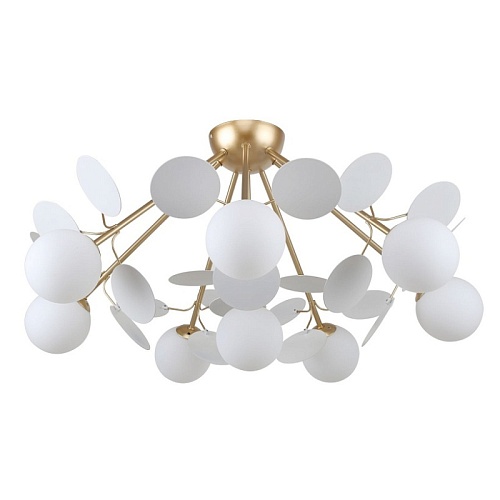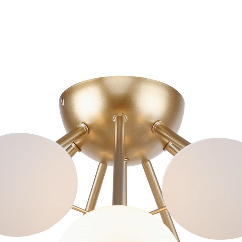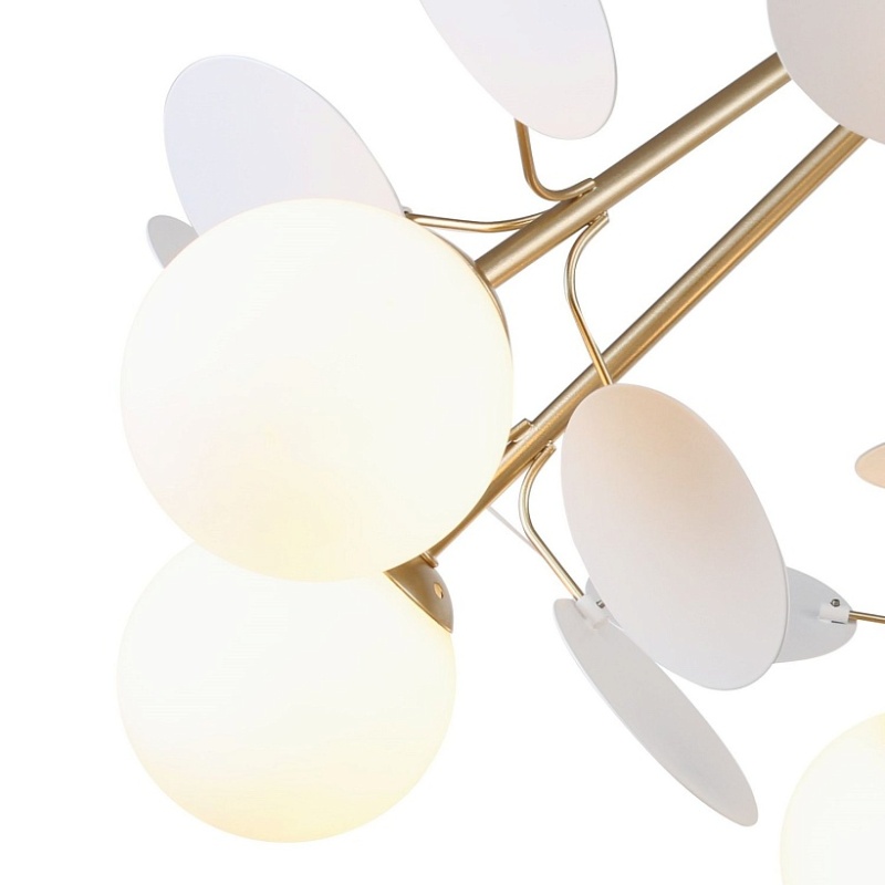 Металлический каркас золотого цвета, круглые стеклянные плафоны молочного цвета, декоративные круглые белые пластины.
