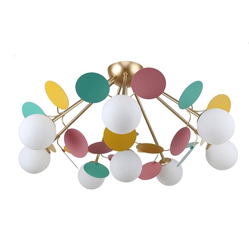 Металлический каркас золотого цвета, круглые стеклянные плафоны молочного цвета, декоративные круглые разноцветные пластины.