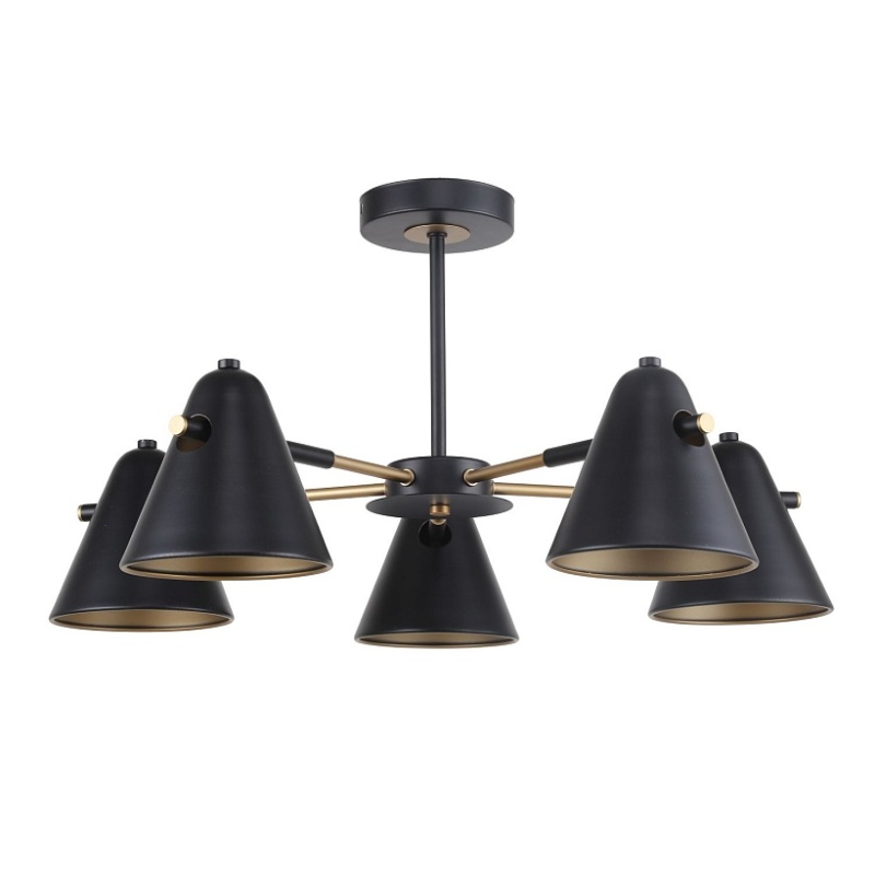 Металлический каркас черного цвета с золотыми декоративными элементами, металлические плафоны конусообразной формы черного цвета.