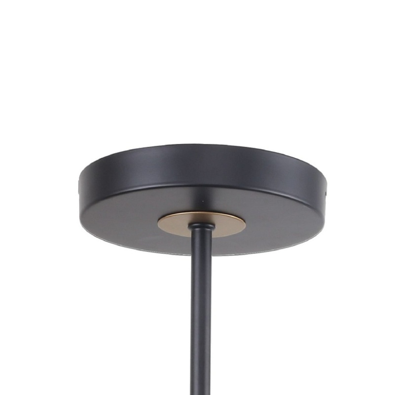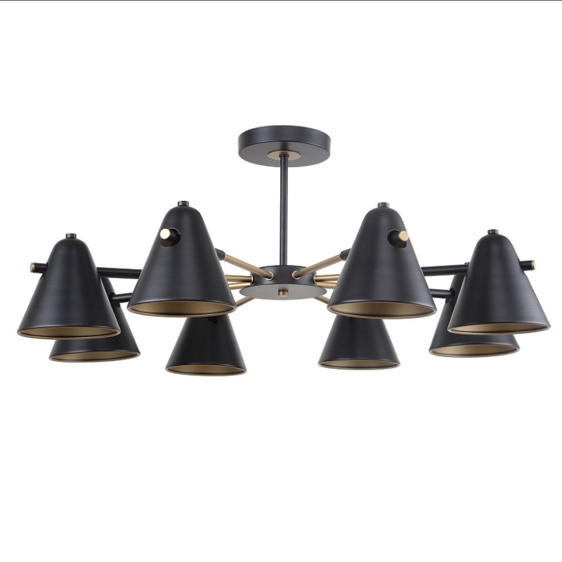 Металлический каркас черного цвета с золотыми декоративными элементами, металлические плафоны конусообразной формы черного цвета.