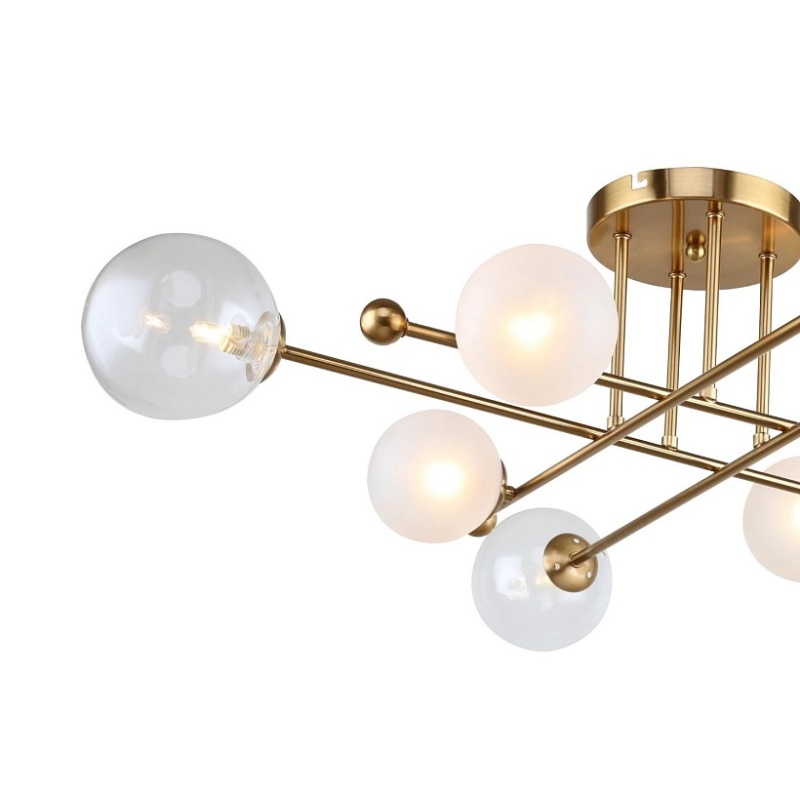 Металлический каркас цвета латунь, выдувные плафоны из белого и прозрачного стекла.