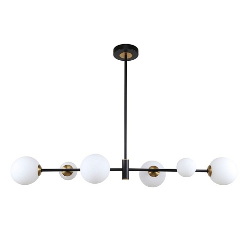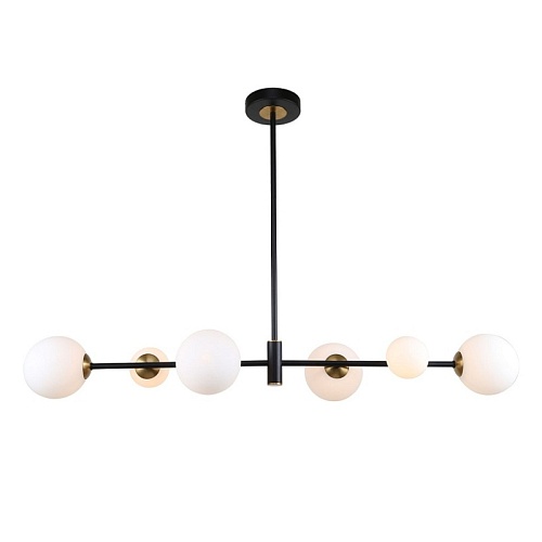 черный каркас с декоративными элементами цвета латуни, плафоны из белого стекла, лампу G9 можно менять