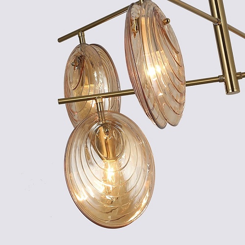 Металлический каркас в цвете латунь, плафоны состоят из двух узорных стеклянных пластин янтарного цвета, цоколь E14, регулируемая высота.