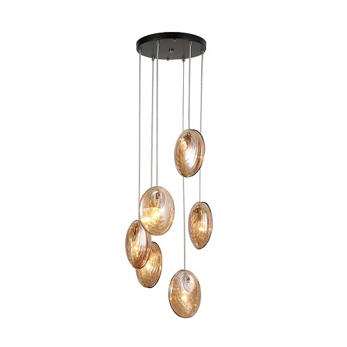Металлический каркас в цвете латунь, плафоны состоят из двух узорных стеклянных пластин янтарного цвета, цоколь E14, регулируемая высота.