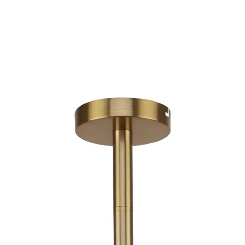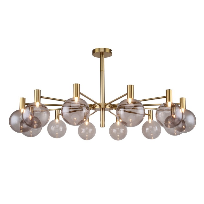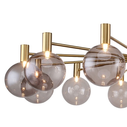 Металлический каркас цвета латунь, круглые плафоны из стекла коньячного оттенка.