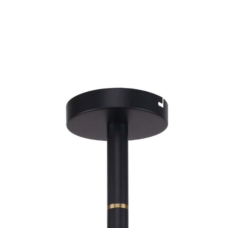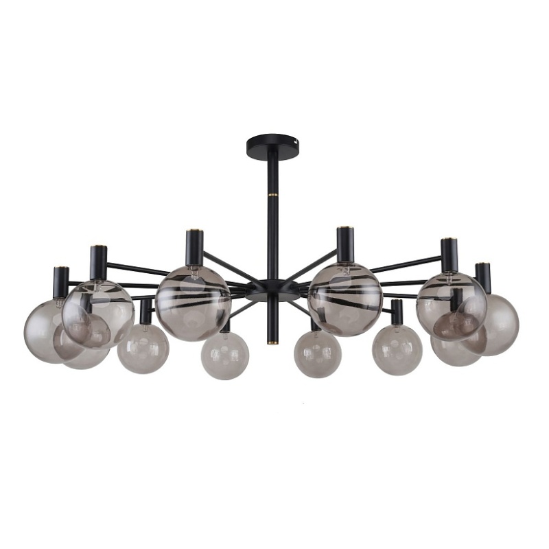 Металлический каркас черного цвета, с тонкими полосками цвета латуни, которые находятся в середине Металлический каркаса, в конце и в основании плафонов, выдувные плафоны серого цвета.