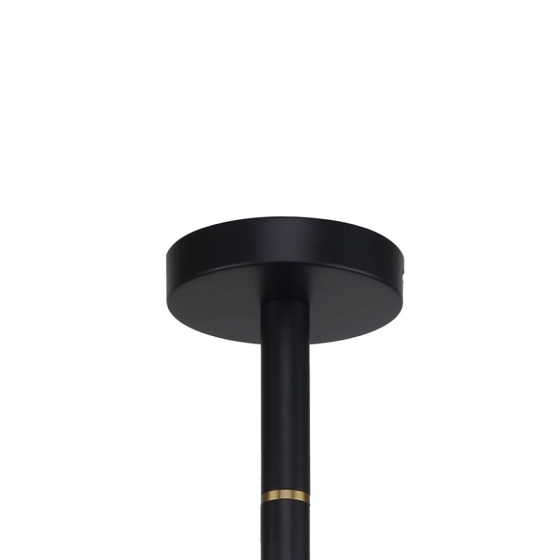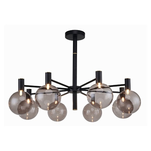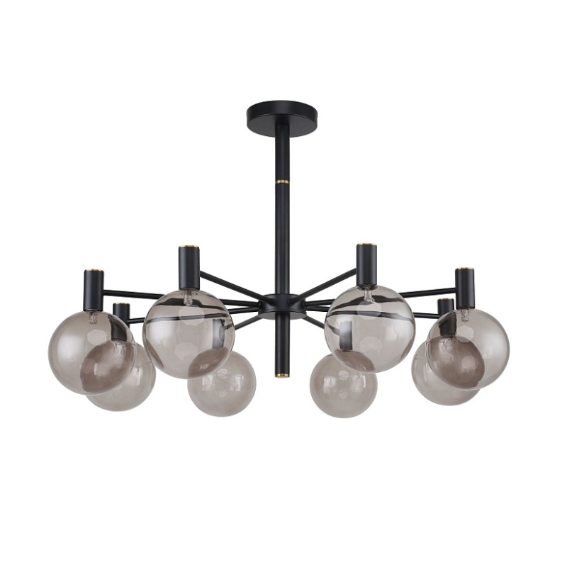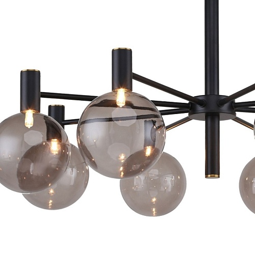 Металлический каркас черного цвета, с тонкими полосками цвета латуни, которые находятся в середине Металлический каркаса, в конце и в основании плафонов, выдувные плафоны серого цвета.
