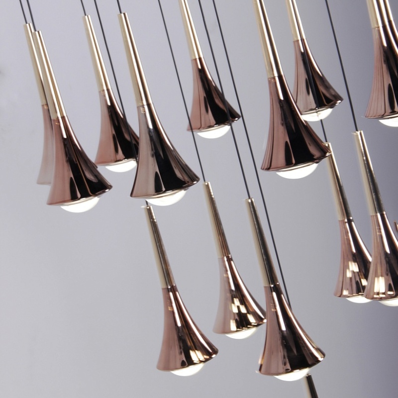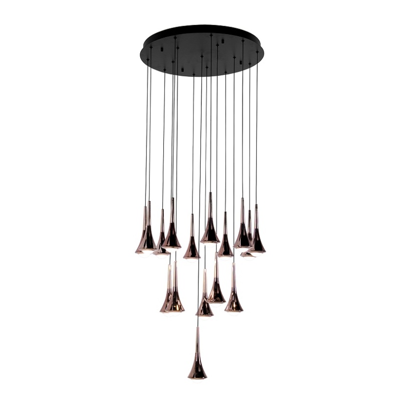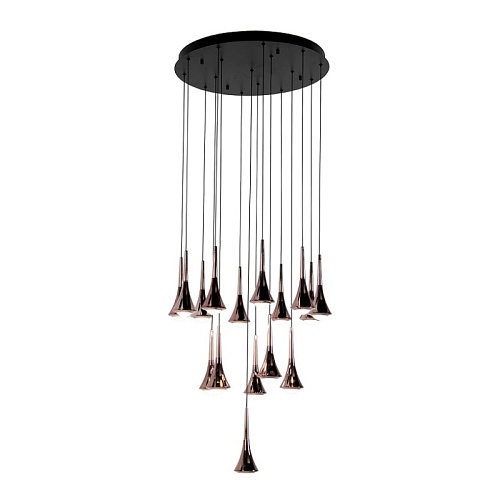 Металлический каркас черного матового цвета, каскад из 16 подвесов, расположенных на разной высоте, покрытых классическим и розовым золотом, встроенные LED-модули, регулируемая высота.