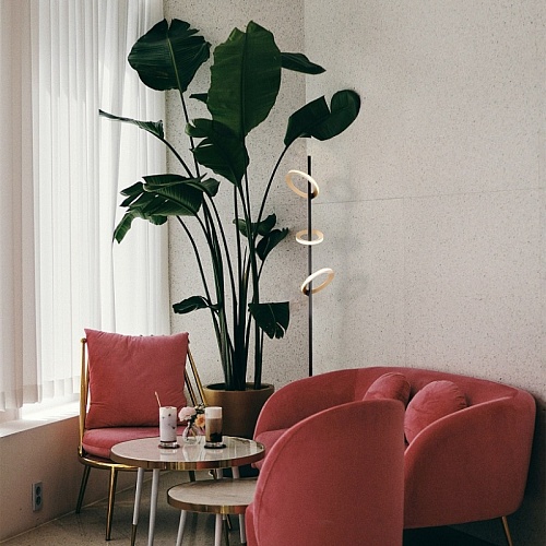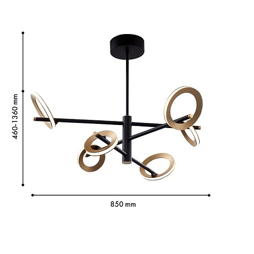 Металлический каркас черного цвета, объемные кольца цвета матовое золото, закреплены под разным углом к каркасу светильника, светятся по периметру благодаря встроенной ленте LED, регулируемая высота.