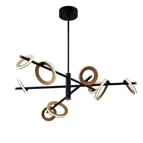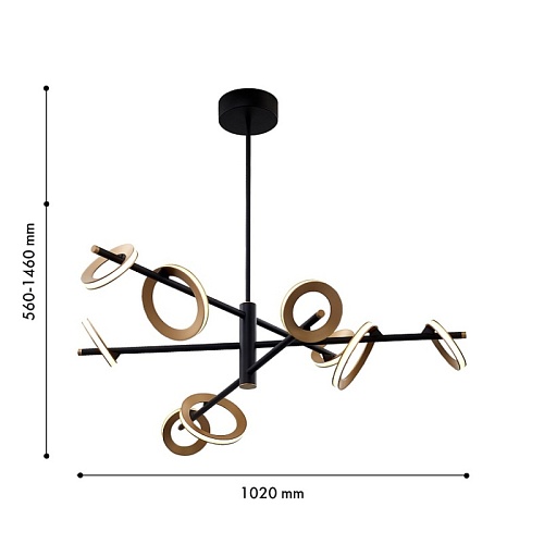 Металлический каркас черного цвета, объемные кольца цвета матовое золото, закреплены под разным углом к каркасу светильника, светятся по периметру благодаря встроенной ленте LED, регулируемая высота.